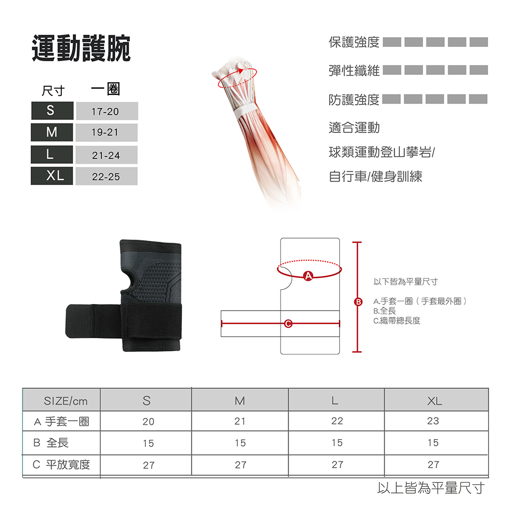 2. 伸縮性強,加強手腕部加壓支撐。
