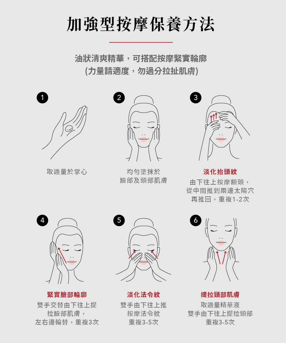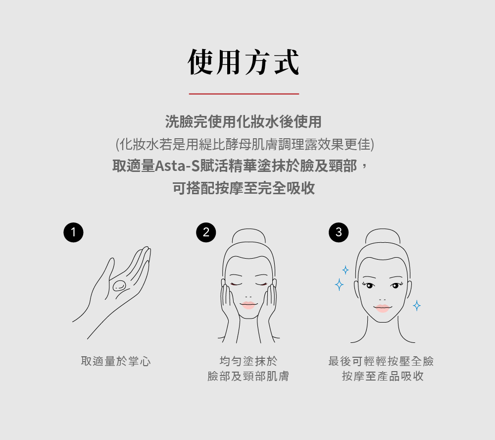 用法 使用化妝水後,取適量精華液輕拍塗抹於肌膚至吸收即可。