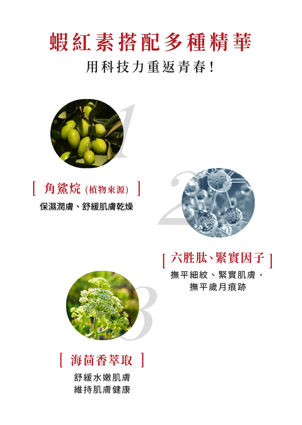 內容物名稱 CYCLOPENTASILOXANE, DIMETHICONOL, ISONONYL ISONONANOATE, SQUALANE, CAPRYLIC/CAPRIC TRIGLYCERIDE, CRITHMUM MARITIMUM EXTRACT, HAEMATOCOCCUS PLUVIALIS EXTRACT, HYDROGENATED SOYBEAN OIL, YEAST EXTRACT, ASTAXANTHIN, BETA-CAROTENE, PENTAERYTHRITYL TETRAISOSTEARATE, STEARALKONIUM HECTORITE, PROPYLENE CARBONATE, PALMITOYL HEXAPEPTIDE-12, GERANYLGERANYLISOPROPANOL, TOCOPHERYL ACETATE, DIMETHICONE CROSSPOLYMER, DIMETHICONE/VINYL DIMETHICONE CROSSPOLYMER, TOCOPHEROL, FRAGRANCE 。