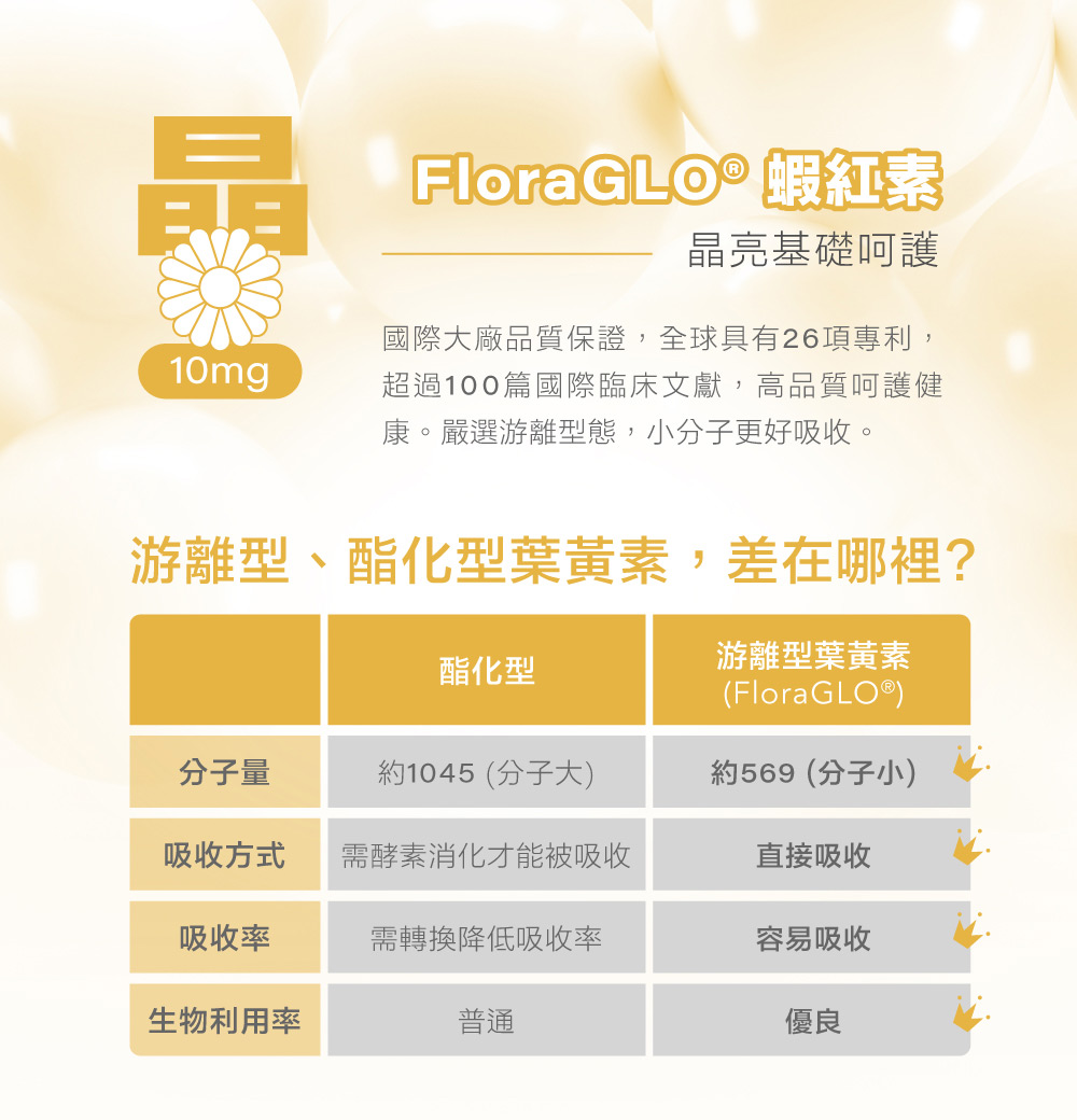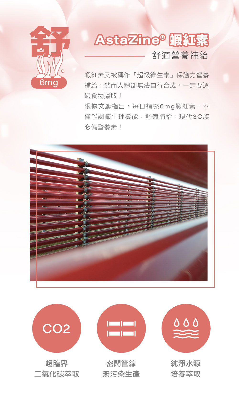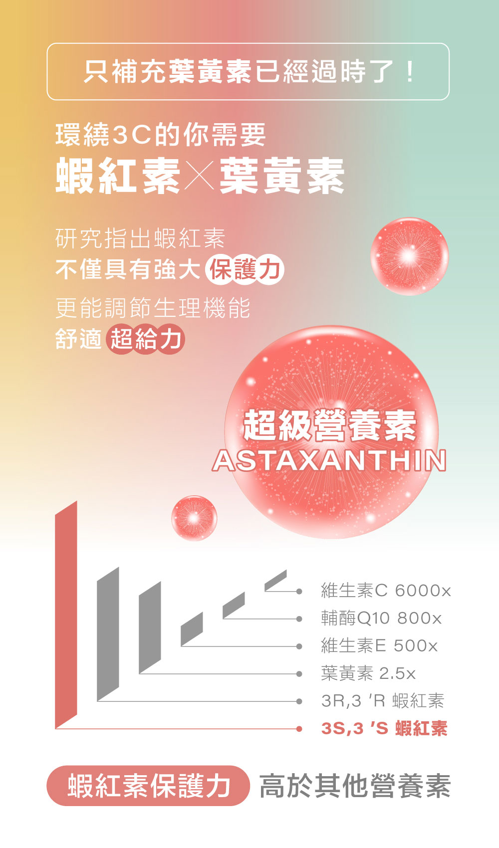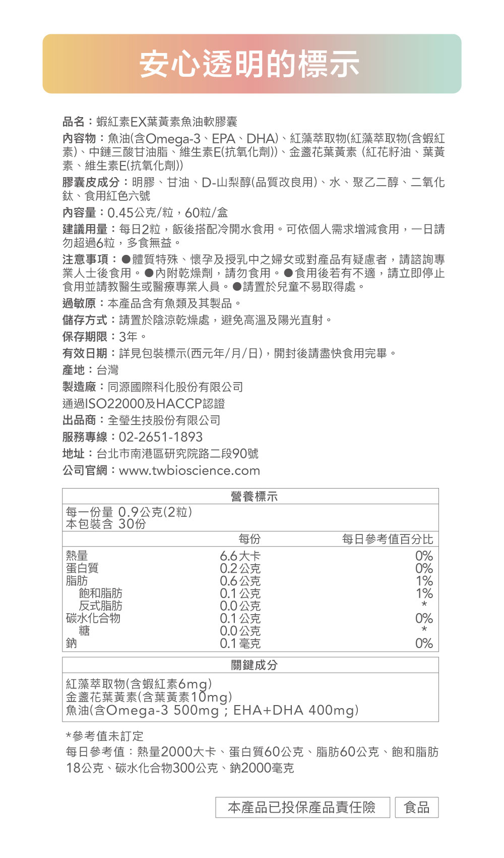 內容物:魚油(含Omega-3、EPA、DHA)、紅藻萃取物(紅萃取物(含蝦紅素)、中鏈三酸甘油脂、維生素E(抗氧化劑))、金盞花葉黃素(紅花籽油、葉黃素、維生素E(抗氧化劑))
