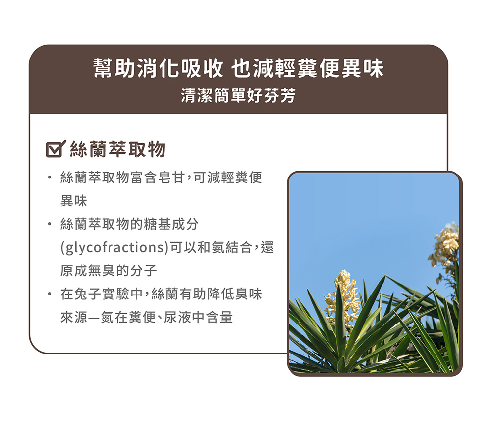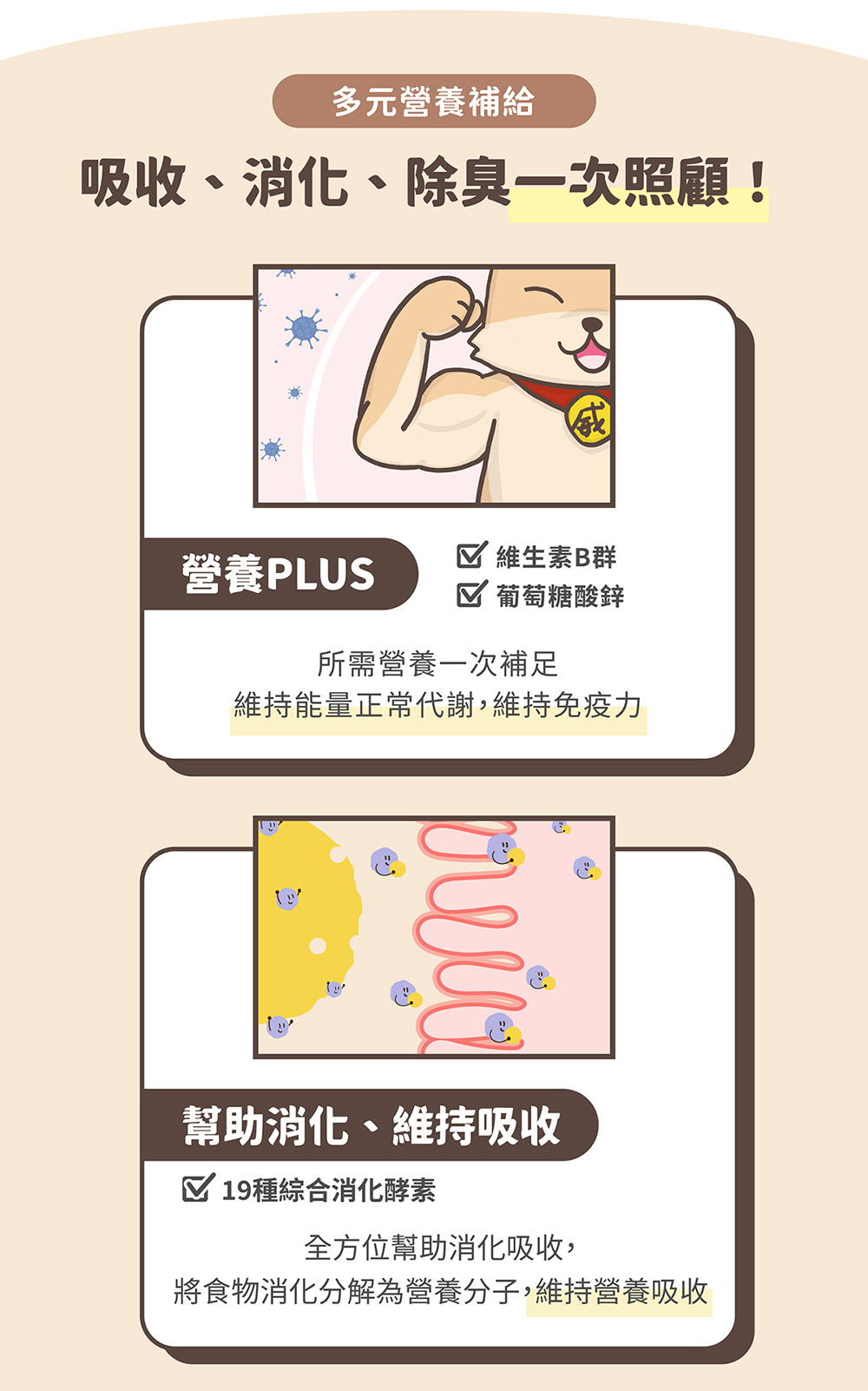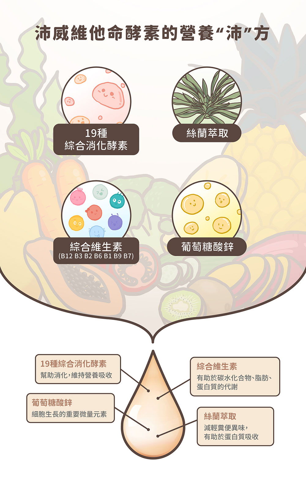 內容物:維生素B群、葡萄糖酸鋅、19種綜合消化酵素、絲蘭萃取物等