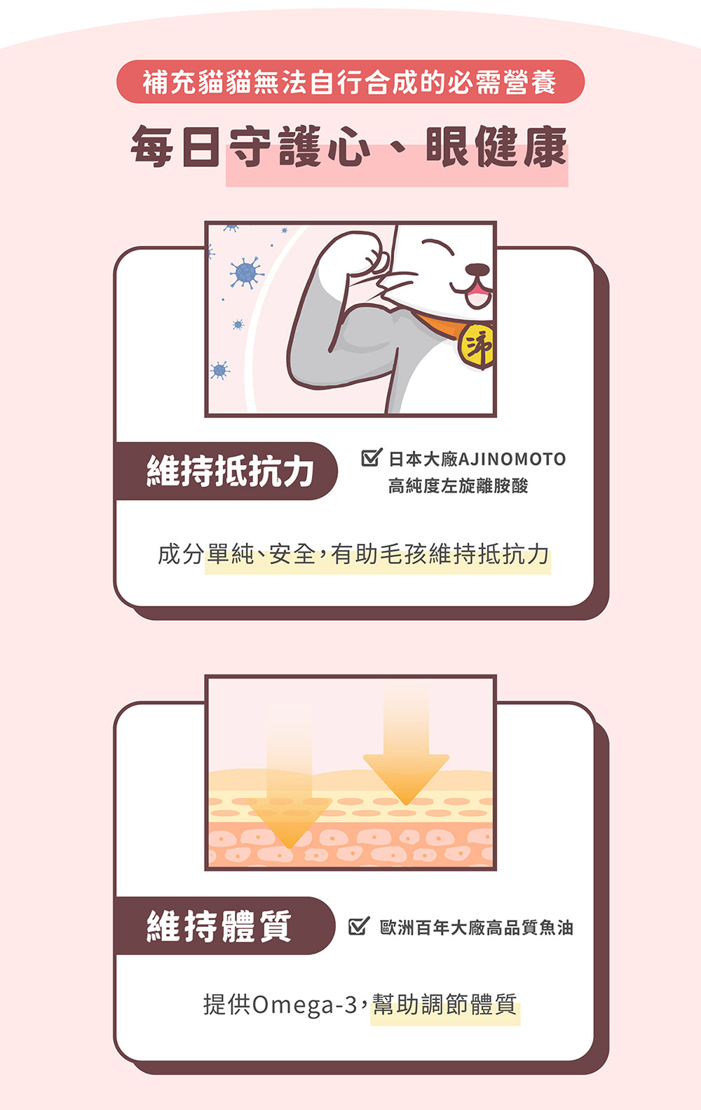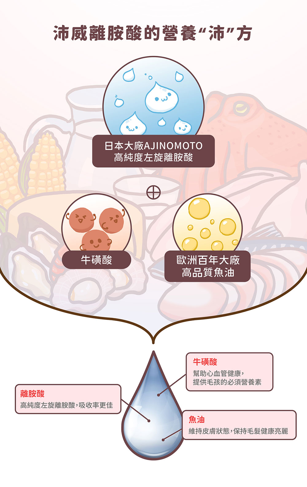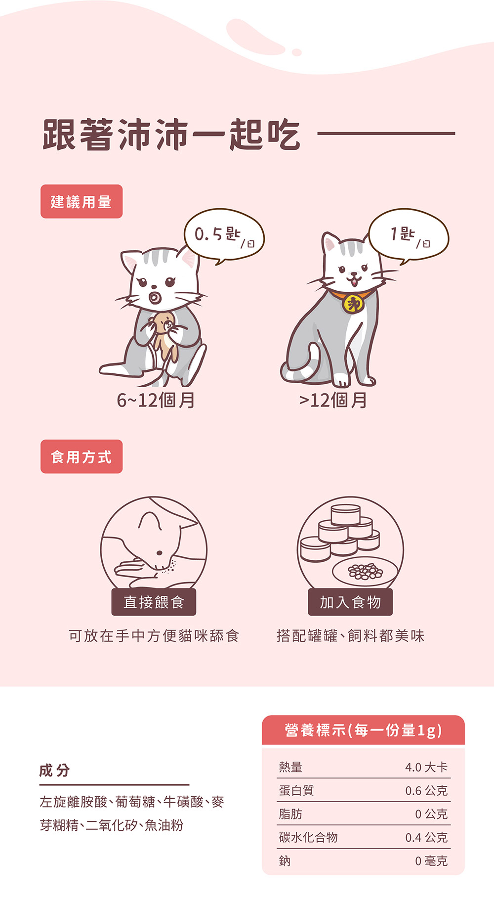內容物:高純度左旋離胺酸、牛磺酸、魚油粉等