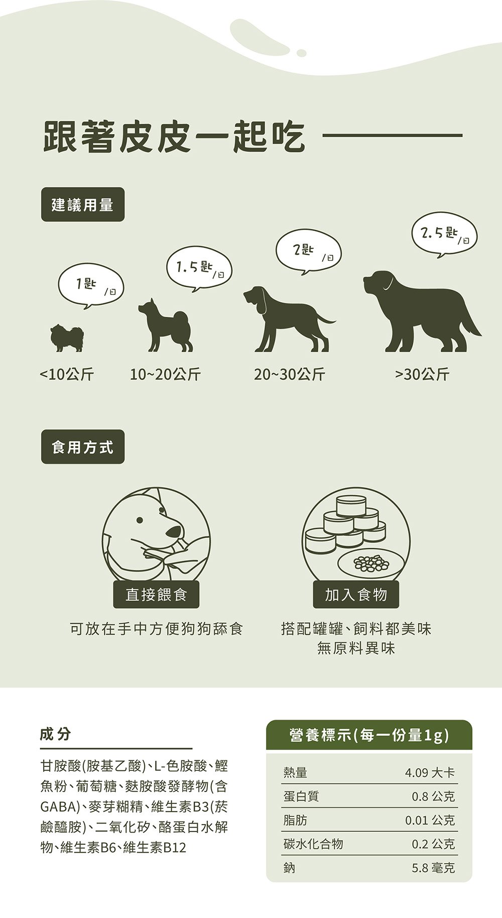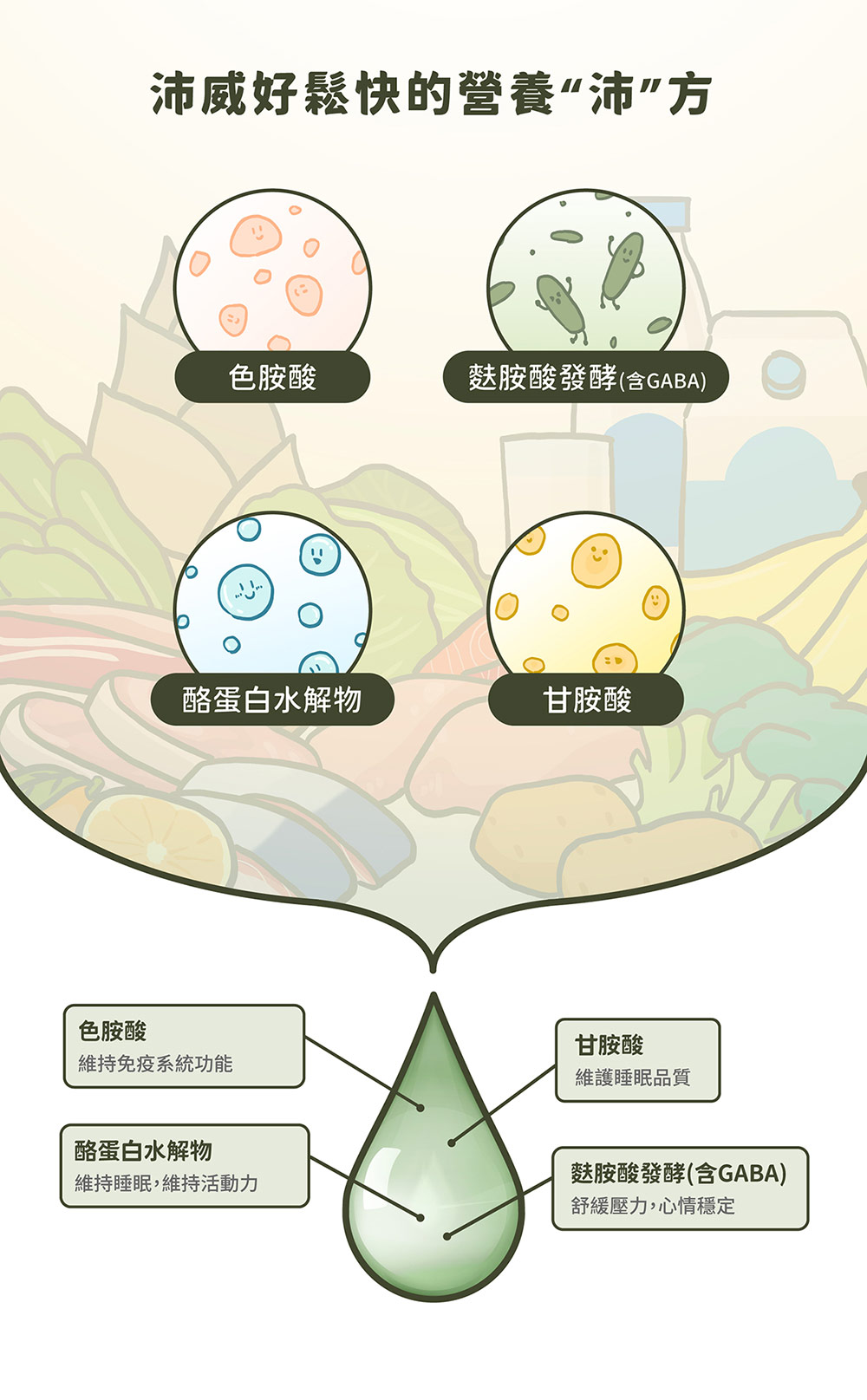 內容物:甘胺酸、L-色胺酸、葡萄糖、GABA、酪蛋白水解物等