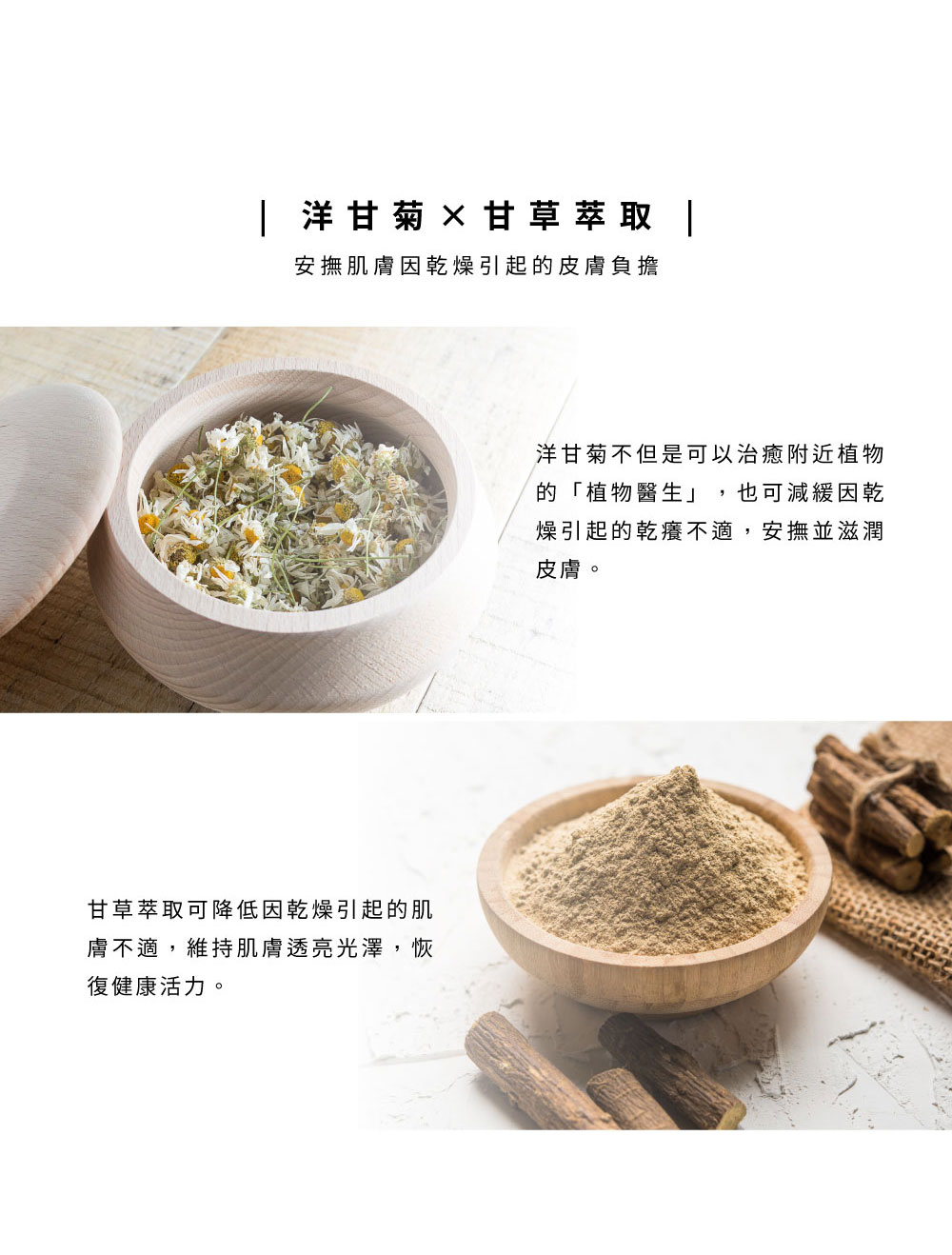 主要成分:胺基酸、維生素E、甘草萃取、洋甘菊萃取、蘆薈精華