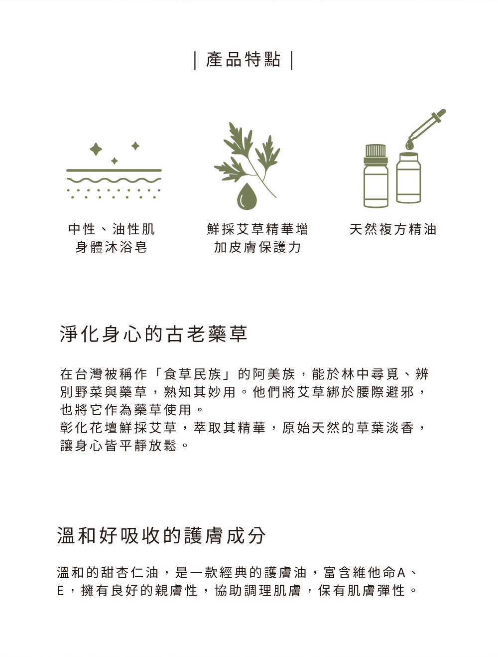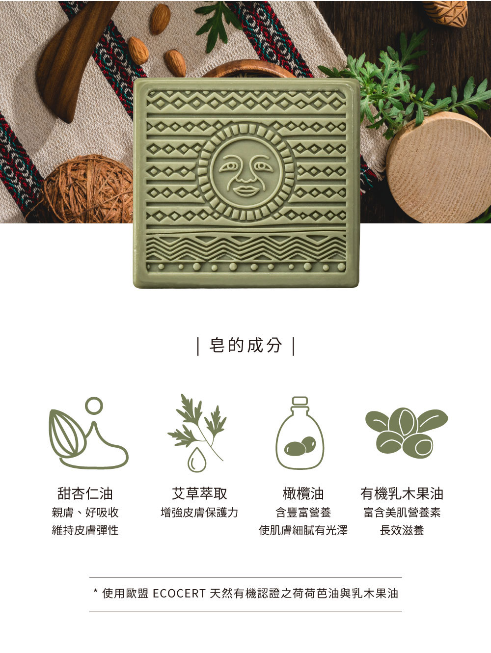 成分:棕櫚油、棕櫚核仁油、廣藿香精油、雪松精油、荷荷芭酯、檸檬草精油、香茅精油、艾草精油、橄欖油、甜杏仁油、艾草萃取、艾草粉