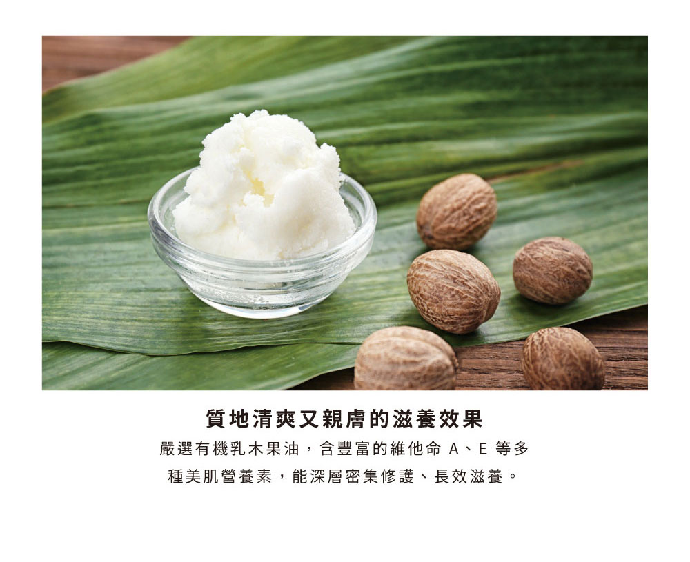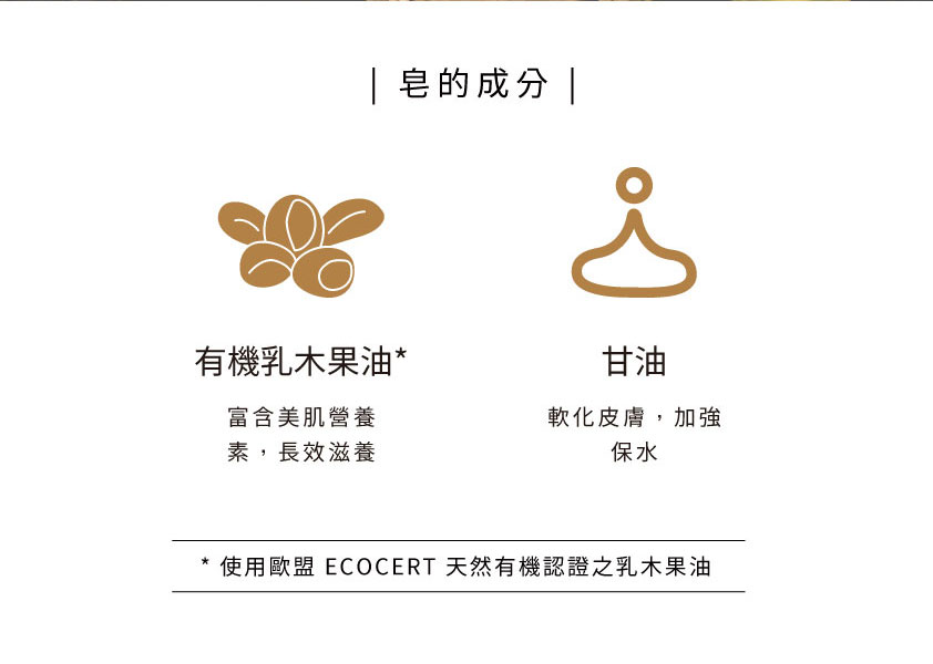 成分:棕櫚油、棕櫚仁油、甘油、有機乳木果油