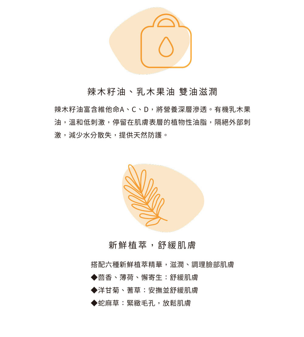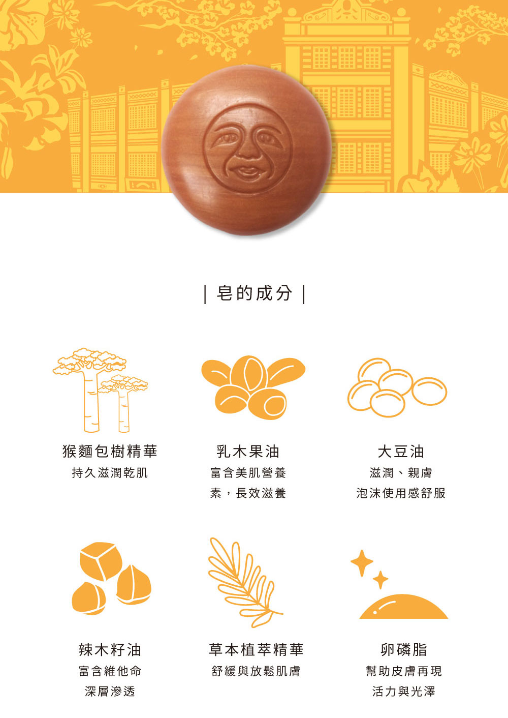 成分:棕櫚油、棕櫚核仁油、辣木籽油、有機乳木果油、大豆油、卵磷脂、猴麵包樹籽精華、草本植萃精華
