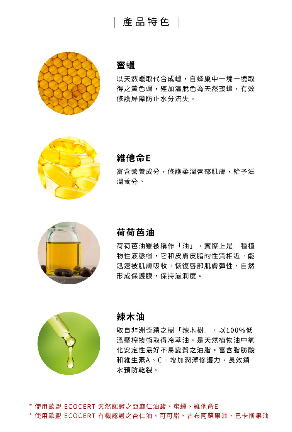 成分:蜜蠟、荷荷芭油、辣木油、可可脂、木魯星果棕脂、巴卡斯果油、維他命E