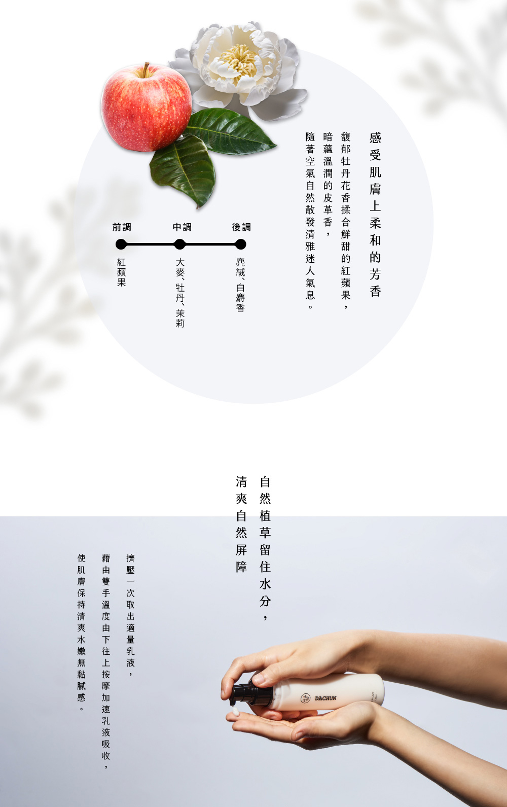 使用方法:於化妝水後,取適量乳液於臉部,輕柔按摩至完全吸收。