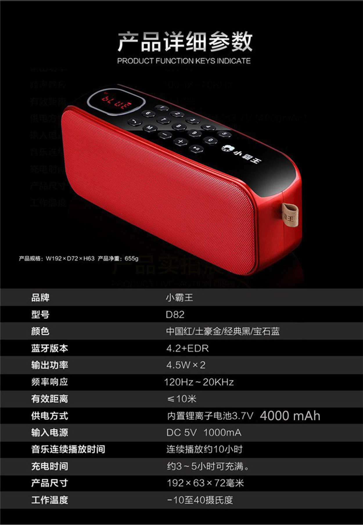 ※ 小霸王D82無線4.2藍牙喇叭、是一款獨立10公分超重低音大振膜、搭配雙5公分內磁大喇叭、使其釋放出更加澎湃、而富有層次的音效、即使在戶外聲音穿透力都很強勁、高靈敏度FM數字調諧收音機、自動保存電台、內置FM無線信號放大器、提高收音靈敏度、FM頻率範圍76~108MHz、信號接收功能穩定、適用於家居、旅行、運動、休閒、娛樂、學習等。