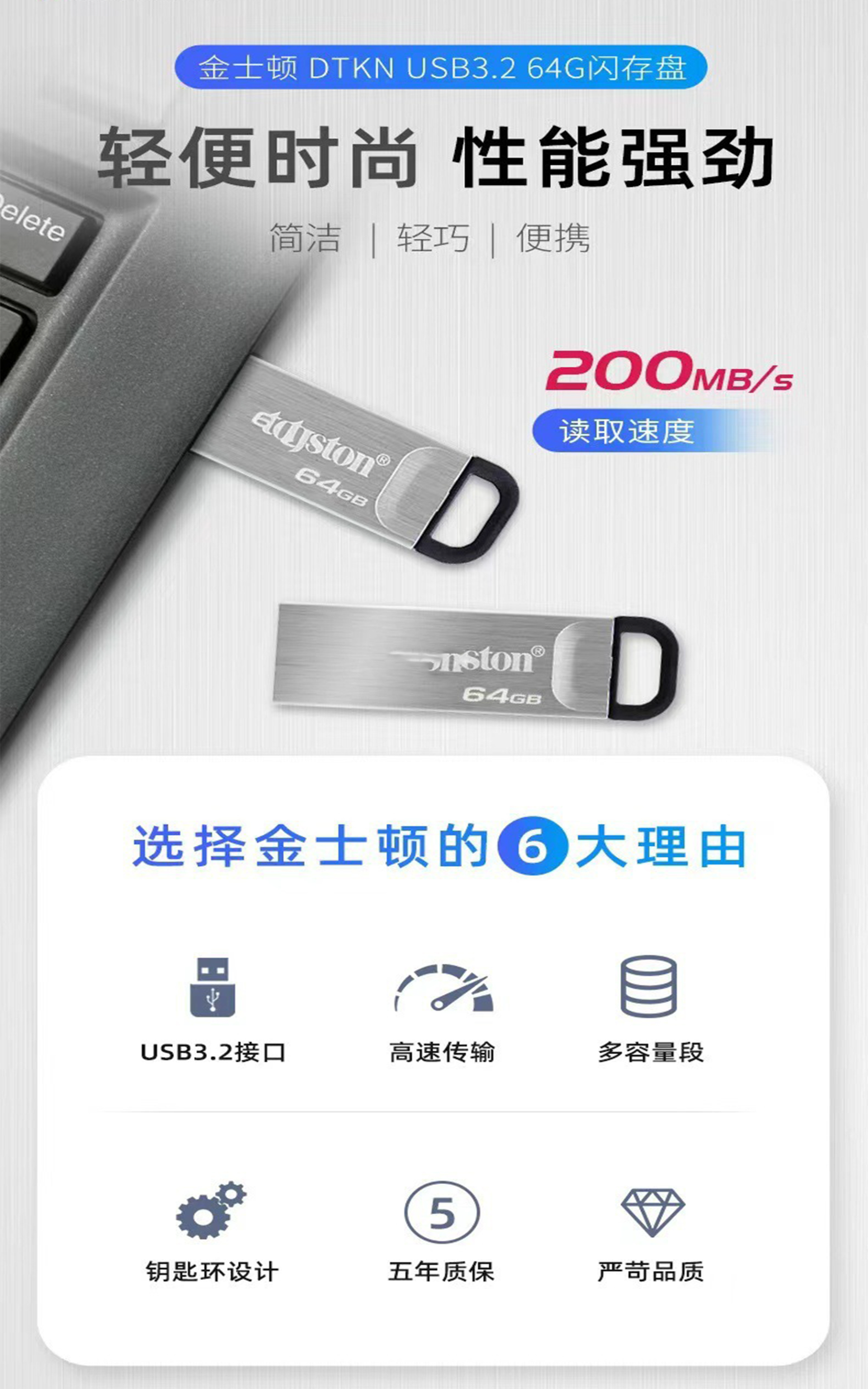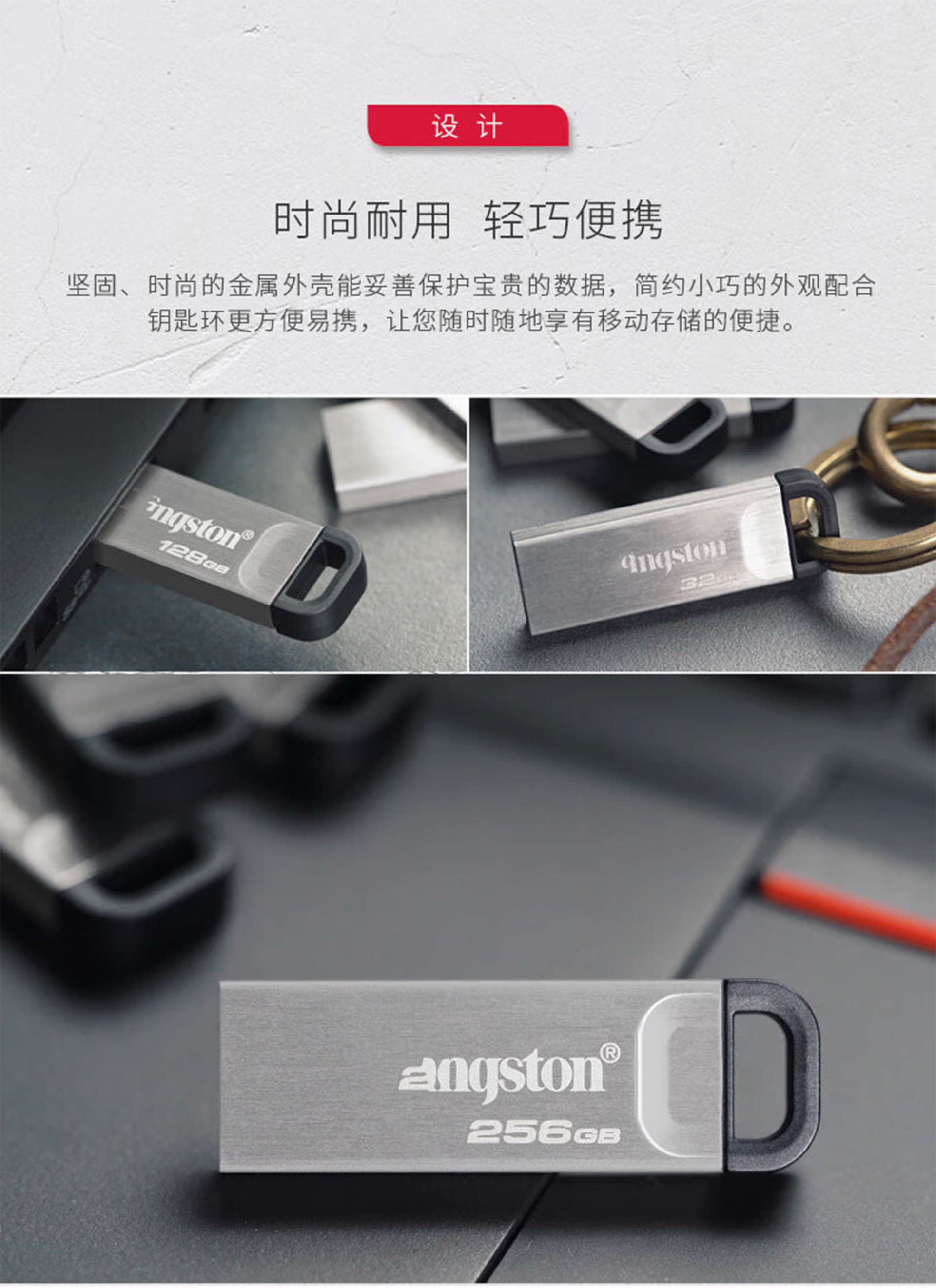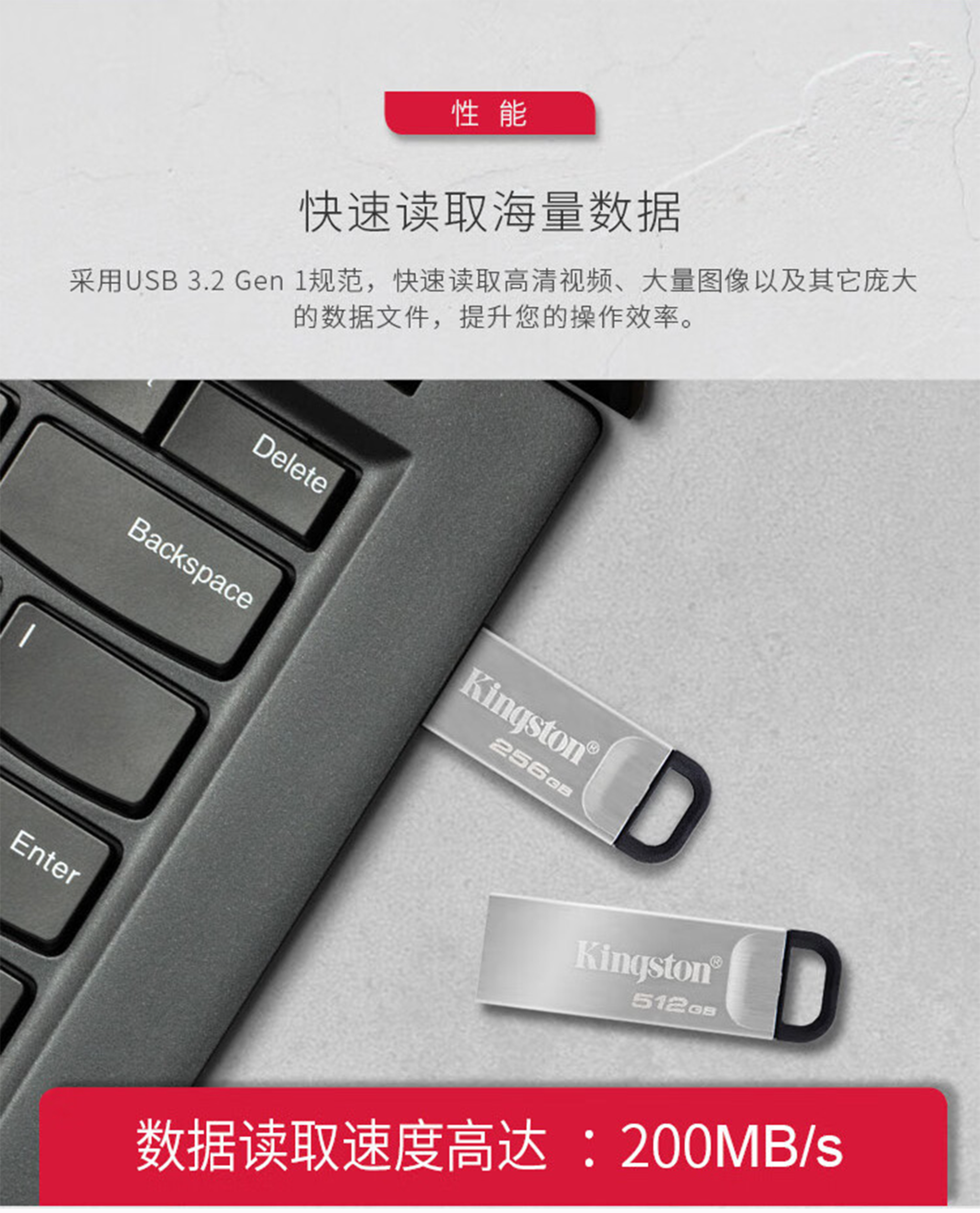 Kingston 的 DataTraveler® Kyson™ 是一款擁有優異效能的 USB Type-A 隨身碟,其具備高達 200MB/s 讀取及 60MB/s 寫入1 的極快傳輸速度,可快速且便捷地傳輸檔案。擁有高達 512GB2 的儲存空間,讓您能隨時隨地儲存和分享相片、影片、音樂等檔案。 無蓋式金屬外殼造型讓您免於擔心保護蓋遺失的問題,而實用的扣環設計方便您隨身攜帶。