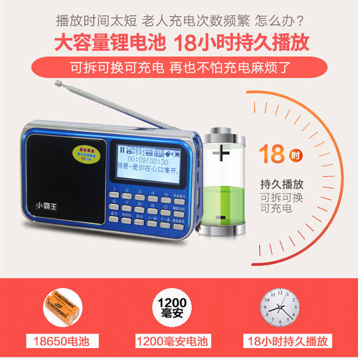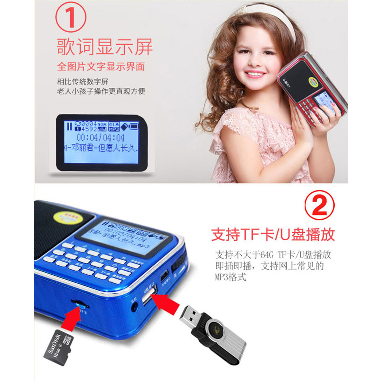 ◇ 顯示螢幕:1.7英寸超大高清,白底黑色顯示 ( 支援繁體字歌名歌詞不會亂碼 )。