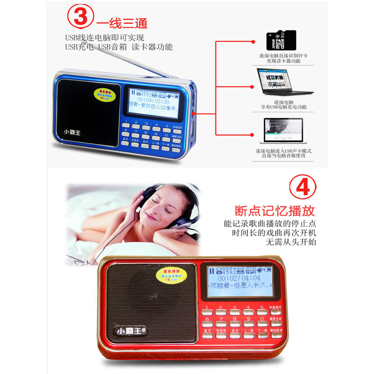 3. 斷電記憶功能、可免去每次從頭聽的苦惱、記憶在斷電時在播放的曲目、下次播放時會從斷電時的那首歌曲開始播放。