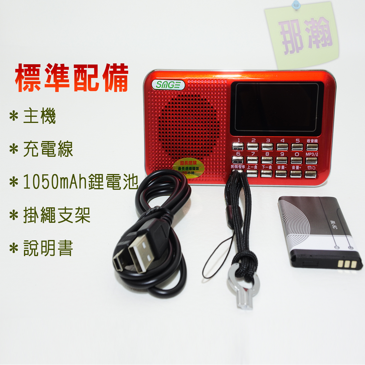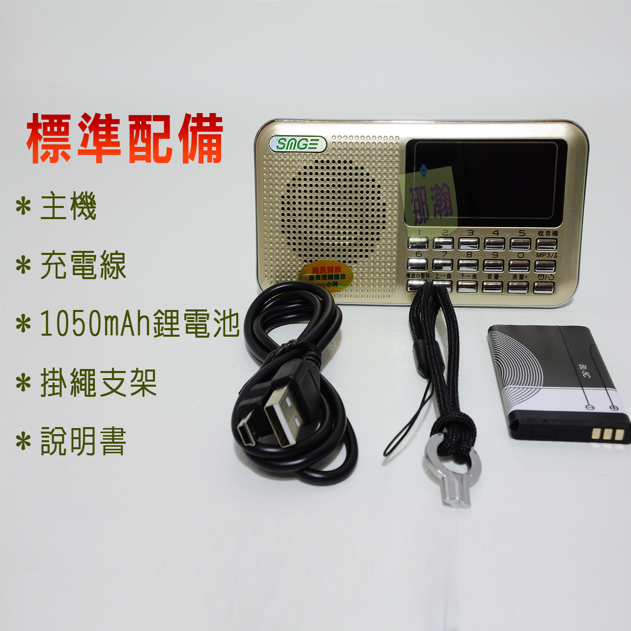 ▲ 標準配備 : 本機x1 BL-5C電池x1 充電線x1 掛繩x1 說明書x1