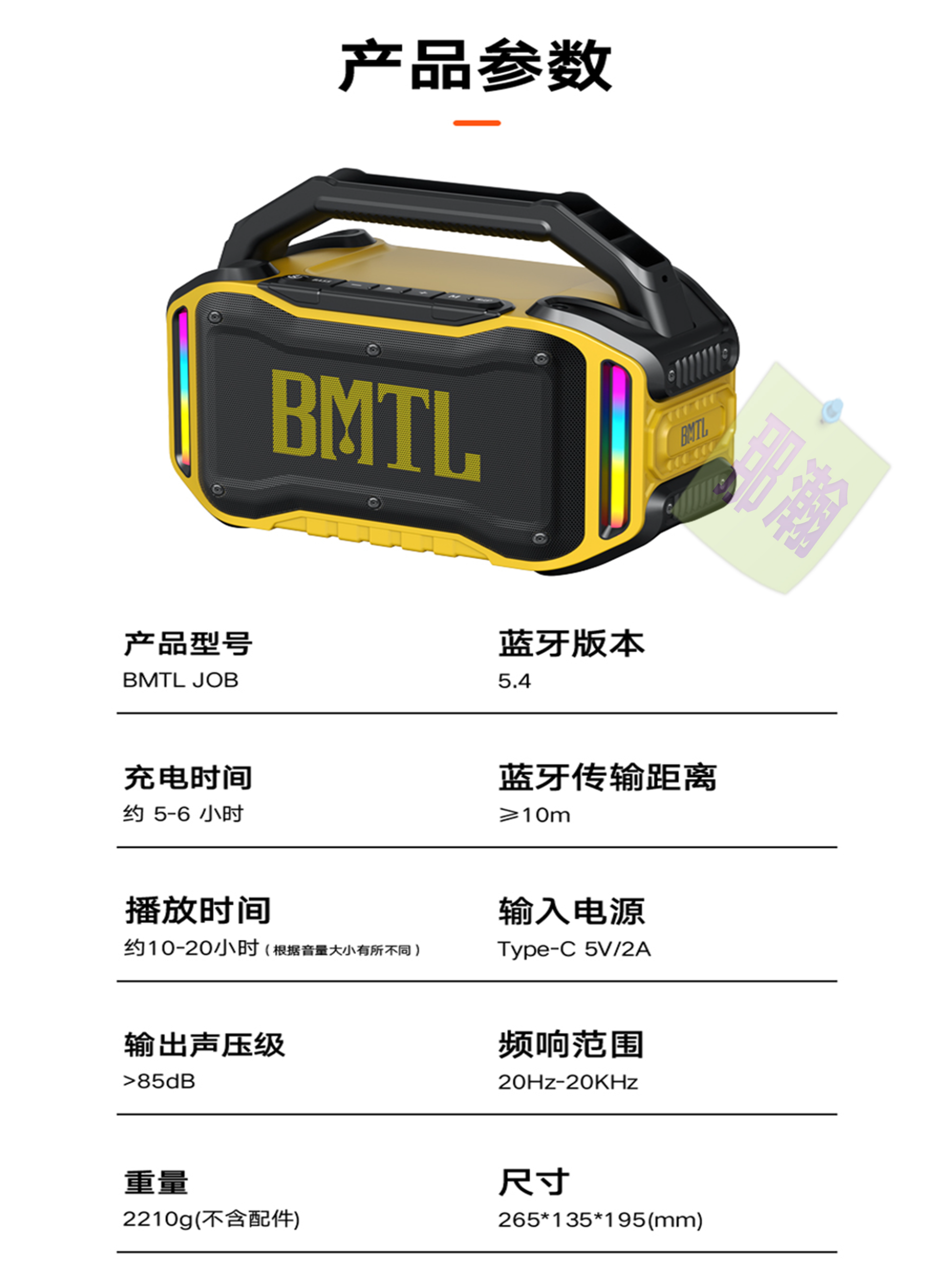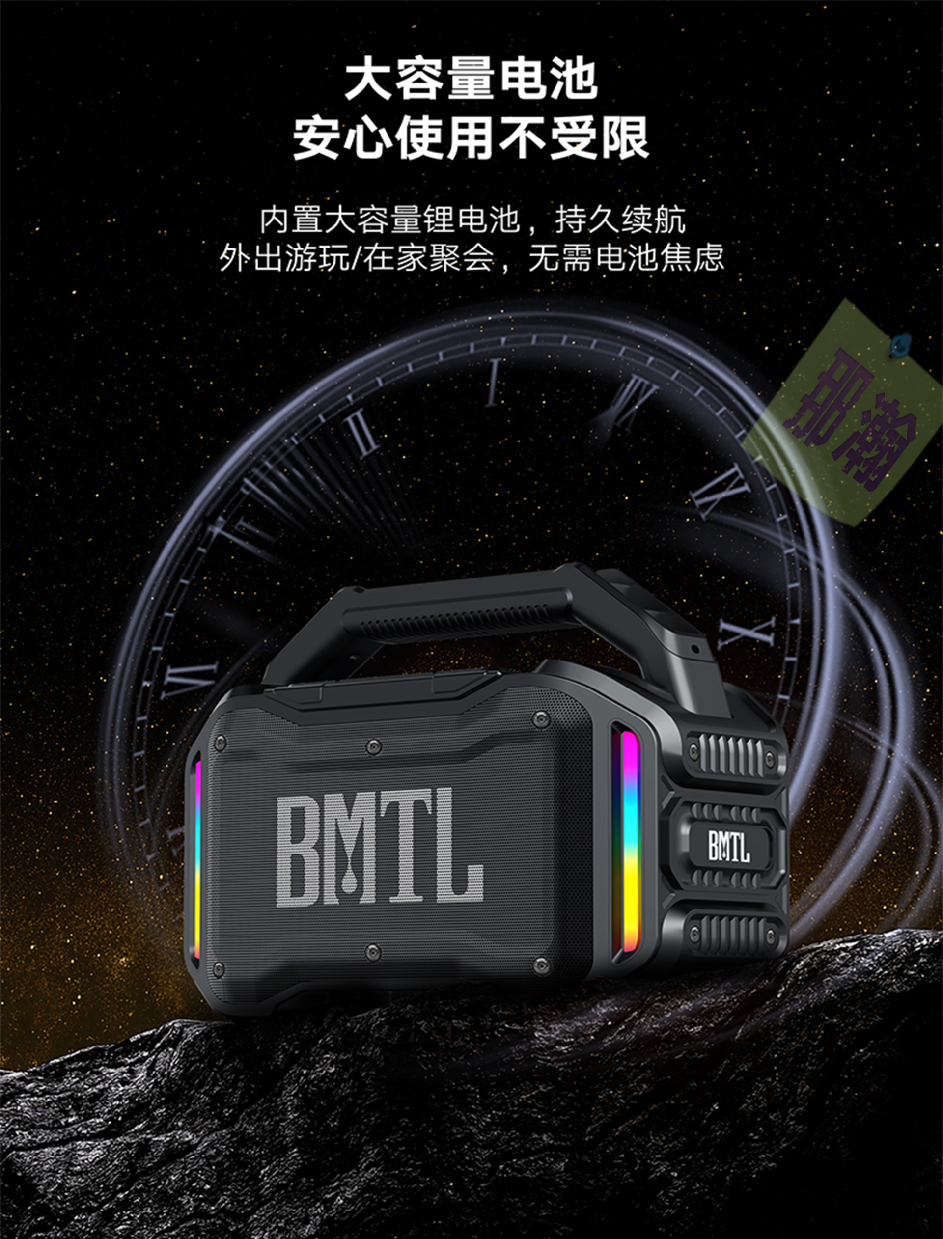 ◇ 電池容量:10000mAh 內置18650電池,充電時間約9小時,有開啟燈效狀態下,音量調大聲播放,時長約7小時 ( 正常音量播放10小時以上 )