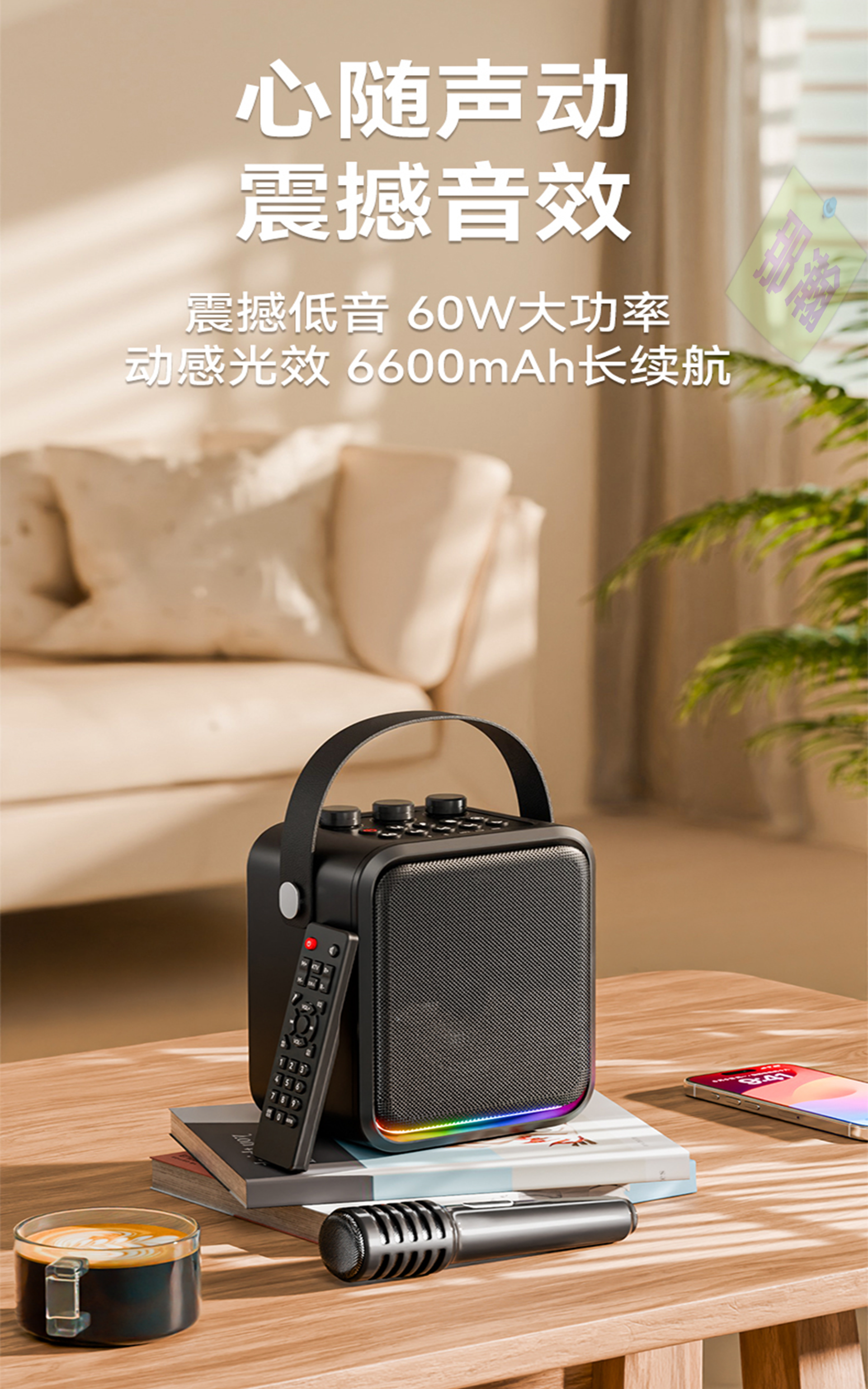 ◇ 標準配備:▲本機+2支麥克風 ▲遙控器 ▲Type-c充電線 ▲3.5mm音源線 ▲中文說明書