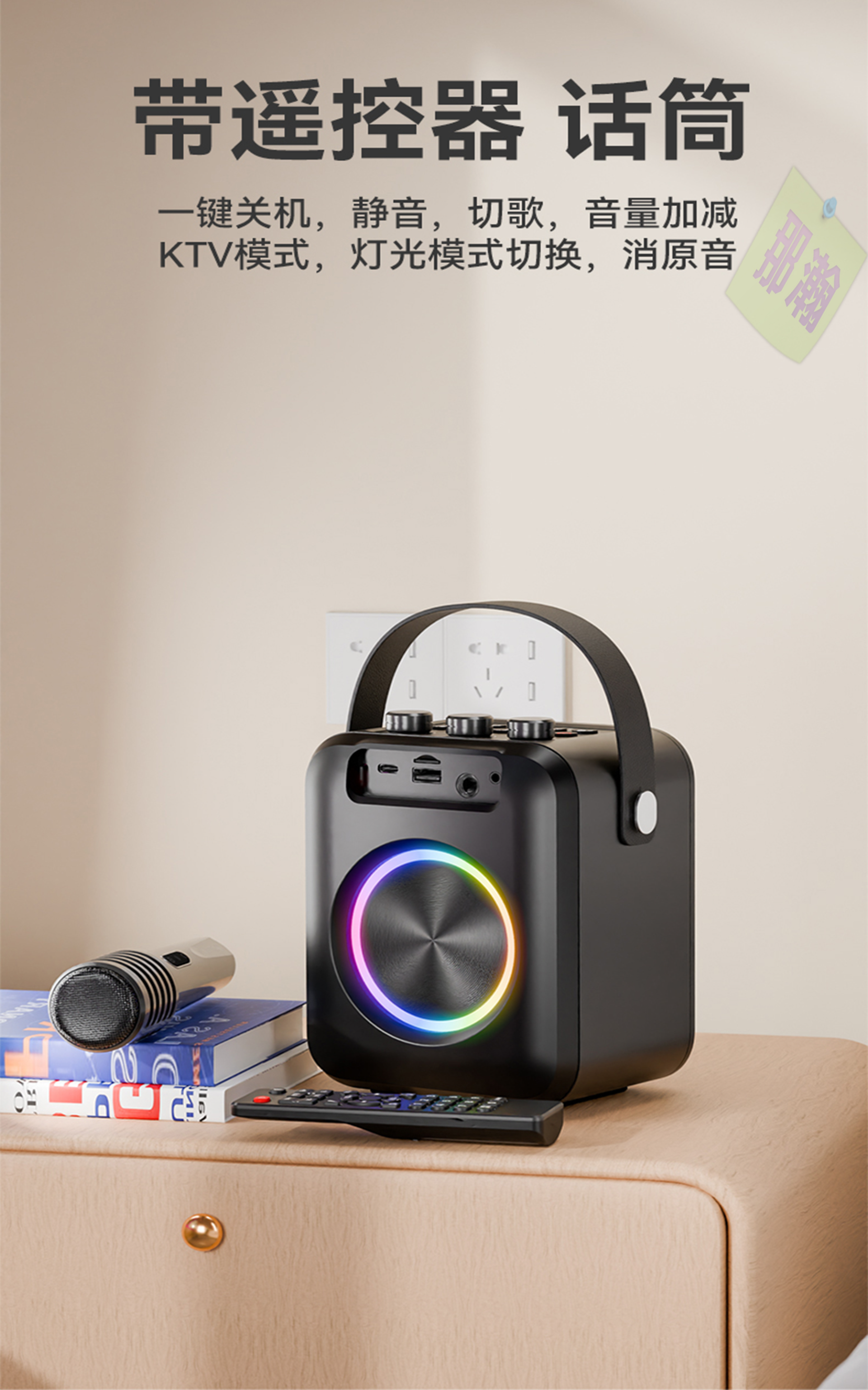 1. 遙控器支持一鍵關機,數字鍵選擇歌曲, K歌支持一鍵消音原唱者, 麥克風獨立控制音量大小 / 混音大小,麥克風支持七種模式,ktv模式 主持模式 男聲 女聲 娃娃聲 機器人 魔音。