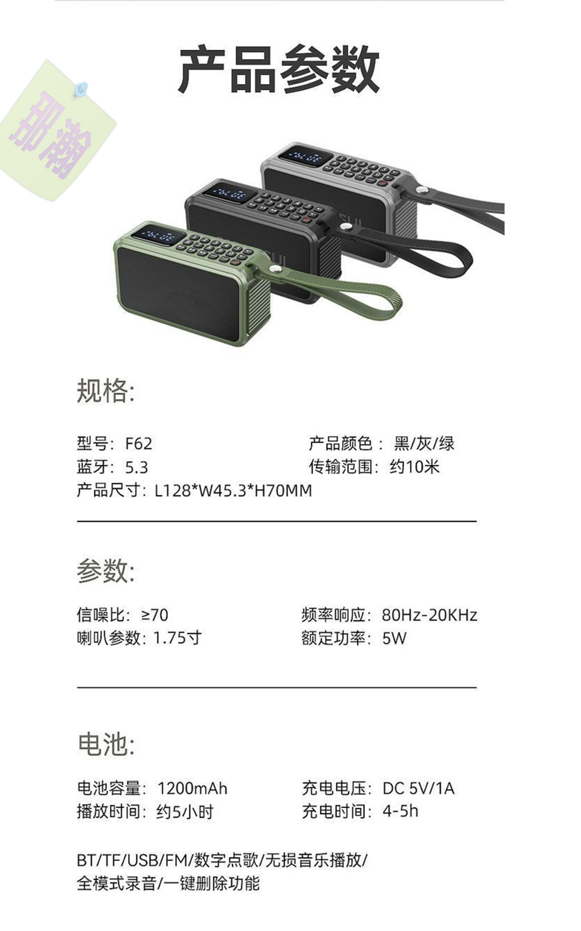 ◇ 喇叭配置:【輸出5瓦】1.75寸全頻喇叭+低頻被動增強單元 ( 音質相當不錯 )。