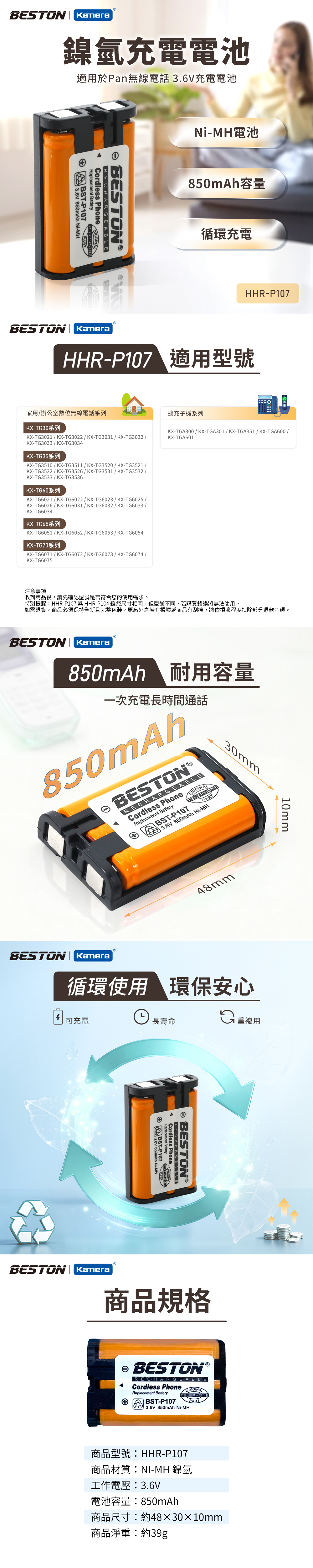 BESTON無線電話電池 for Panasonic HHR- P107