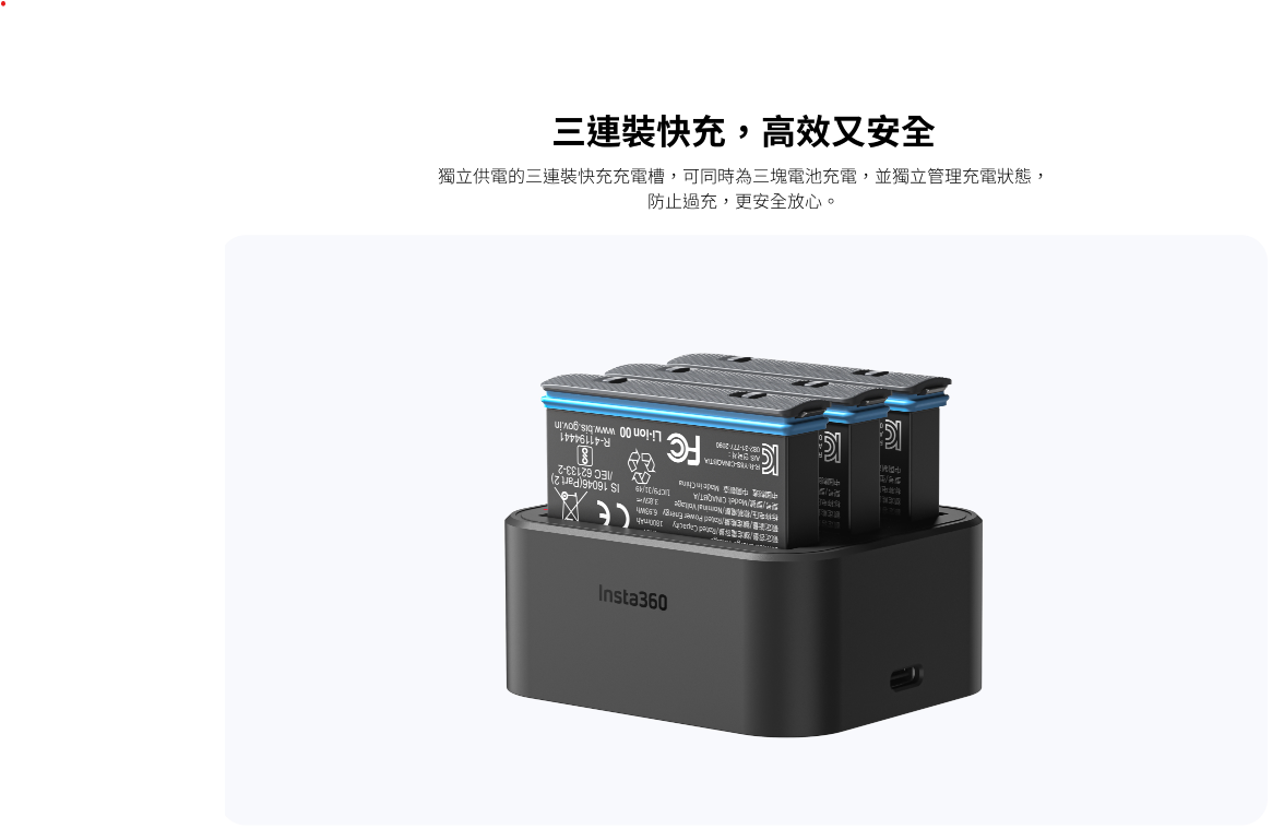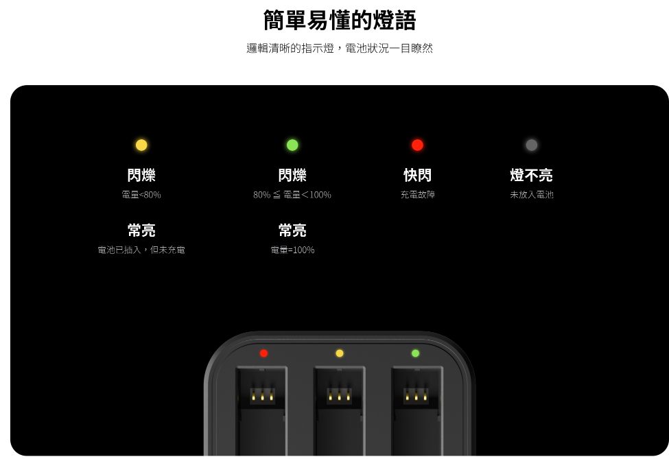 • 充電底座可供三塊電池同時充電