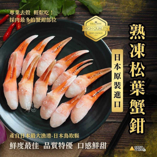 產自日本最大漁港鳥取縣境港市,品質特優,鮮甜細緻絕佳口感,肉質細緻飽滿,專業去殼,採肉最多的蟹鉗部位,輕鬆吃蟹肉!完美熟度,保留松葉蟹的原始鮮味,退冰就能當冷盤料理,也可清燙或火鍋,但不宜煮過久以免影響口感唷!