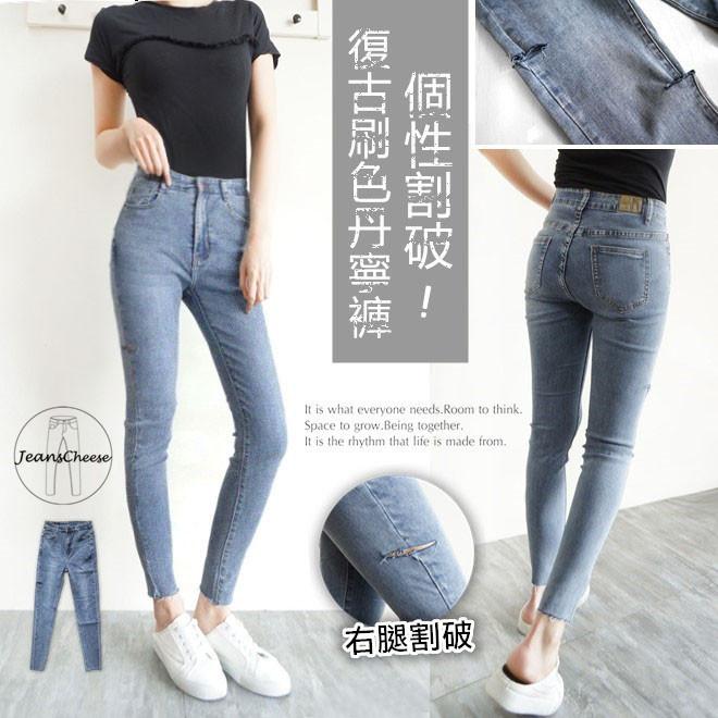 中腰顯瘦超彈力.時尚復古水洗丹寧.割破牛仔褲.薄彈.牛仔長褲.個性不修邊抓鬚褲管.長褲女.刷白牛仔褲.S3.0235
