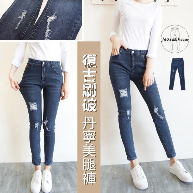 歐美風.顯瘦超彈力.復古刷色水洗丹寧.刷破牛仔褲.牛仔長褲.中低腰.九分褲.九分牛仔褲.長褲女.女裝.F4.8643
