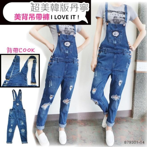 S~XL👏👏👏韓版大口袋美背膝破洞挺版吊帶長褲 .N9.301