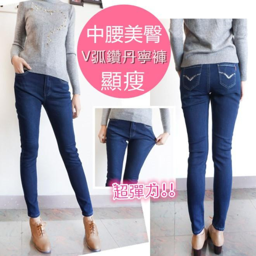 M~3L中腰 顯瘦V弧鑽美臀素面 丹寧 牛仔褲#.N7.958
