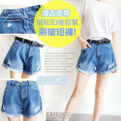 S~XL前鈕扣後鬆緊 復古皮帶刷破短褲 女裝#.Z9.602