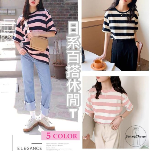 日系文青逆齡💕顯瘦 條紋T恤 落肩上衣 短袖T恤 大學T 棉T 短T 短袖棉T 橫紋T恤 休閒上衣 圓領T恤 女裝