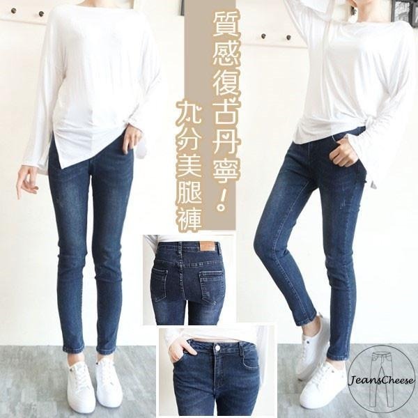 S~2L歐美風.顯瘦修身彈力石磨感.復古低調深藍水洗丹寧九分.女 牛仔褲.牛仔長褲. 長褲.九分褲.褲子W4.7743