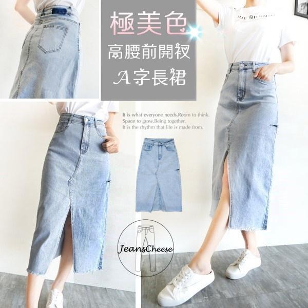 高腰.顯瘦.前開衩.牛仔裙.A字長裙.水洗.牛仔長裙.超彈力割破 長裙過膝裙 .韓系 A字裙.下擺抓鬚#.T7.347