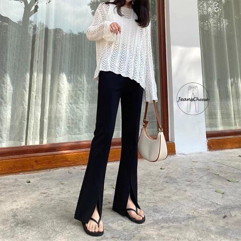 高腰激瘦挺版.超彈性.開衩喇叭褲.鬆緊帶.黑褲.黑色長褲.工作褲.微喇叭褲..韓版長褲女.緊身褲修身褲.S4.9143