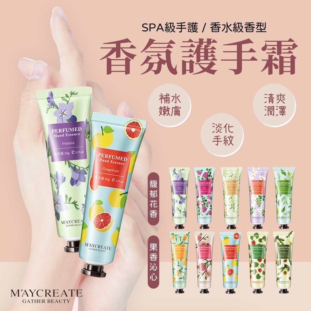 商品規格: 品牌:MAYCREATE 瓶身:約長14公分*寬3公分 香味:10種(詳內文) 淨重:30g 保存期限:3年 (標示於外包裝) 使用方法:提取多種植物精華,每款味道都很好聞,質地細滑,保濕滋潤玉手