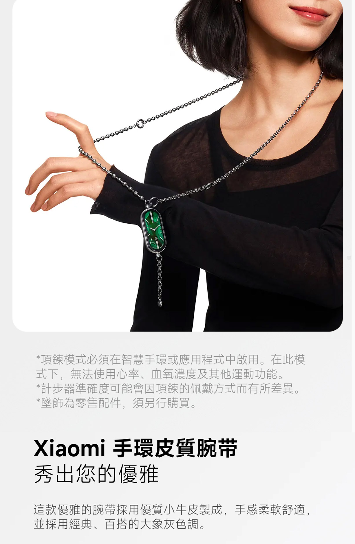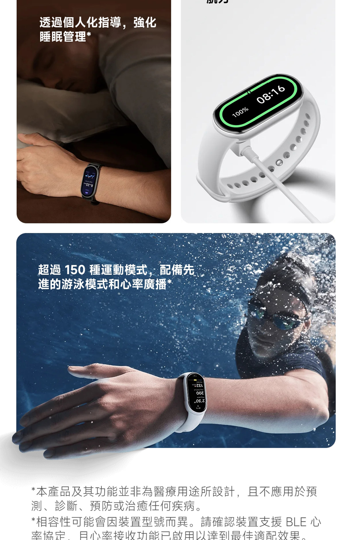 *最深 50 公尺的防水功能:根據 ISO 22810 第一版:2010 測試標準:Xiaomi 手環 10 經 TÜV SÜD 認證防水。防水等級報告編號:68.189.24.0798.01。5ATM 防水等級 (相當於 50 公尺的潛水泵深度)。可在泳池中、近岸游泳時及進行其他淺水活動時佩戴手錶。不適合在熱水淋浴、桑拿浴或潛水時穿戴。務必避免湍急水流造成的直接影響。防水功能並非永久,並且可能會隨時間而逐漸衰減。