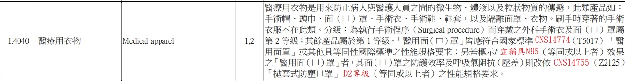 效能:限醫療器材分類分級管理辦法「醫療用衣物(I.4040)」第一等級鑑別範圍。