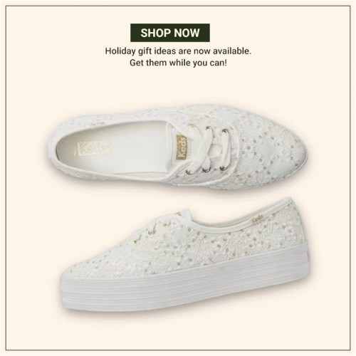 如果你也正在尋找那雙既夢幻又隨性的婚鞋,不妨看看 Keds 與 Kate Spade 最近再次聯名推出的婚嫁系列帆布鞋,設計師在鞋上加上了不少浪漫的元素,像是水晶、珍珠與閃粉,絕對能輕鬆搭配任何婚紗。
