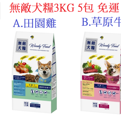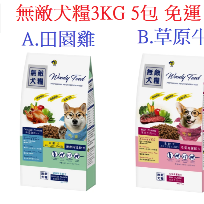 台灣製造 無敵犬糧(田園雞肉) 規格:3kg 商品內容 主要成分:穀類(玉米、小麥、小麥副產品)、肉粉(雞肉粉、牛肉粉(來自澳洲)、絲蘭萃取物、豆粉、動物油脂、魚油、酵母粉、維生素(A、D、E、B 1、B 2、B6、B 12)、葉酸、泛酸、菸鹼酸、生物素)、礦物質(鋅、銅、錳、硒、碘)、氣化膽鹼。 營養成分: 蛋白質 18.0%↑、脂肪10.0↑、纖維5.0%↓、灰分9.0%↓、鈣0.8%↑、磷0.6%↑、水分10.0%↓ 無敵犬糧 (草原牛肉) 規格:3kg 商品內容 主要成分:穀類(玉米、小麥、小麥副產品)、肉粉(雞肉粉、牛肉粉(來自澳洲)、絲蘭萃取物、豆粉、動物油脂、魚油、酵母粉、維生素(A、D、E、B 1、B 2、B6、B 12)、葉酸、泛酸、菸鹼酸、生物素)、礦物質(鋅、銅、錳、硒、碘)、氣化膽鹼。 營養成分: 蛋白質 18.0%↑、脂肪10.0↑