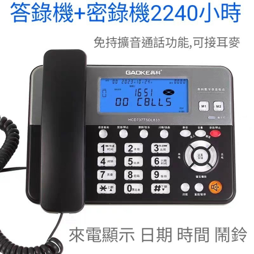 答錄機+錄音機/密錄機 有線電話,2240小時錄音,免持 擴音 通話功能,來電顯示號碼 日期 時間 鬧鈴 可接耳麥