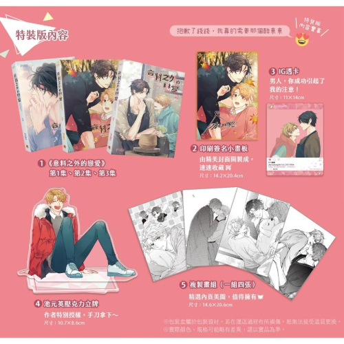 #意料之外的戀愛1+2+3特裝版 112.7/20上市 @990- #PIBI 特裝版收錄  ❶《意料之外的戀愛》第1集、第2集、第3集  ❷ 池元英壓克力立牌  ❸ 印刷簽名小畫板  ❹ IG透卡  ❺ 複製畫組(一組四張)