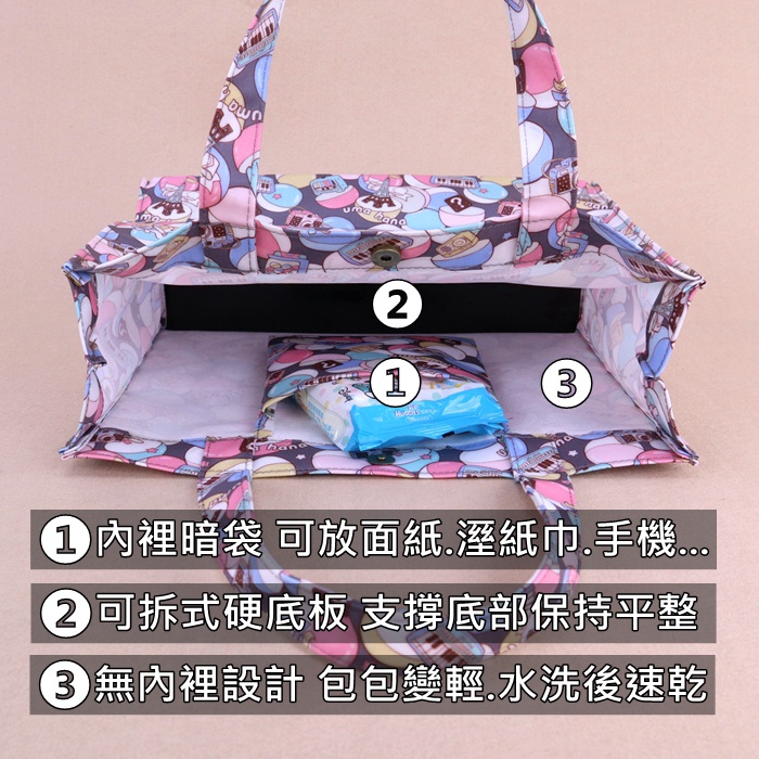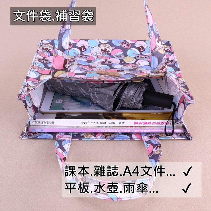 可橫放A4的文件袋,上班上課/外出旅遊/環保購物袋/運動游泳袋都適合,開口為磁扣設計方便開闔,附加底板設計增加物品平穩,堅固硬挺的提把讓包包耐重耐磨,防水材質耐髒好清洗,台灣製造防水包。