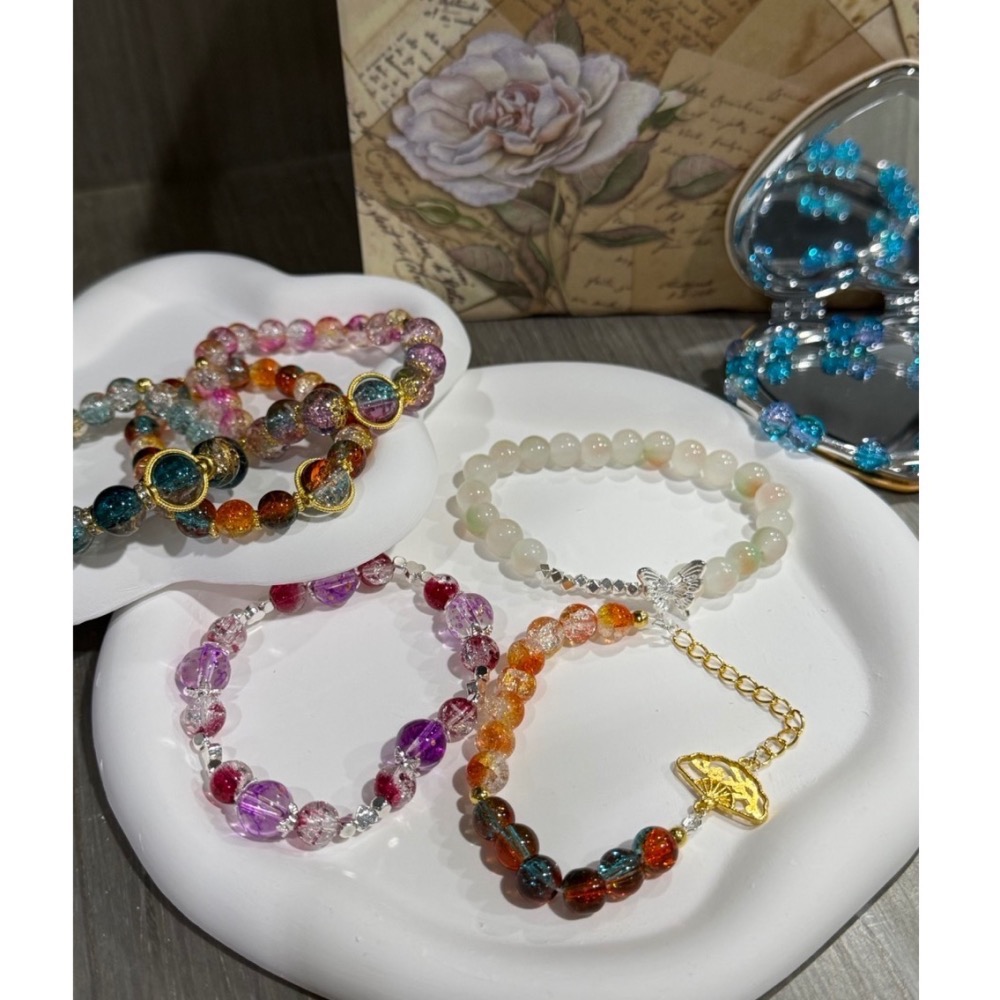 琉璃在光影下展現透亮紋理,色澤層次迷人,不論日常或特別場合,都能為你增添柔亮與魅力。