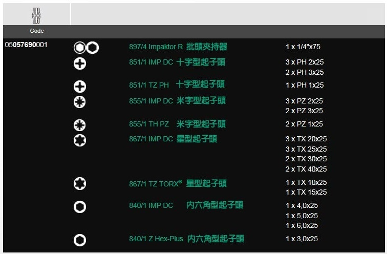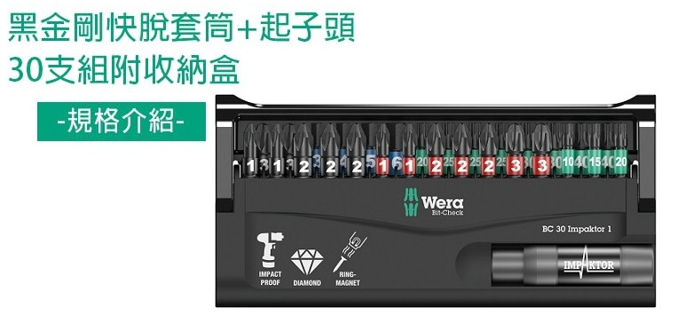 ●1個帶卡環、環形磁鐵的Impaktor夾持器,23個Impaktor批頭和6個標準扭轉批頭。