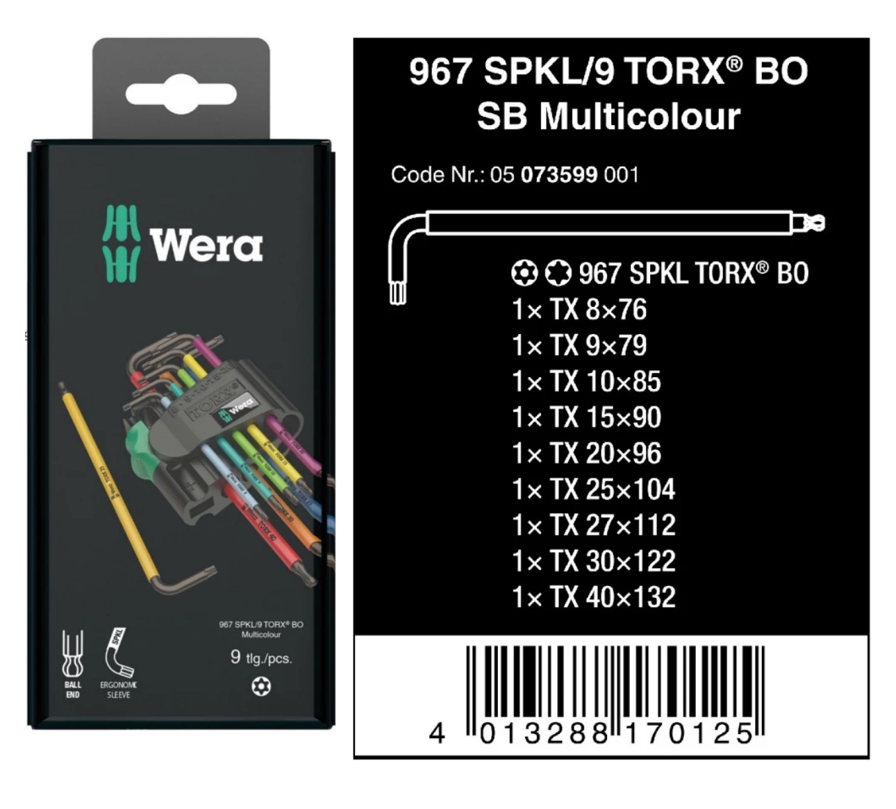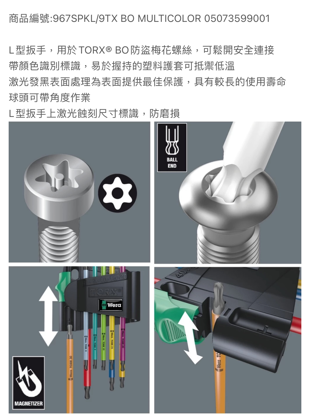 德國【WERA】 967 SPKL/9TX BO 彩色膠套星型球頭中孔扳手9支組-附增消磁器 星型中空