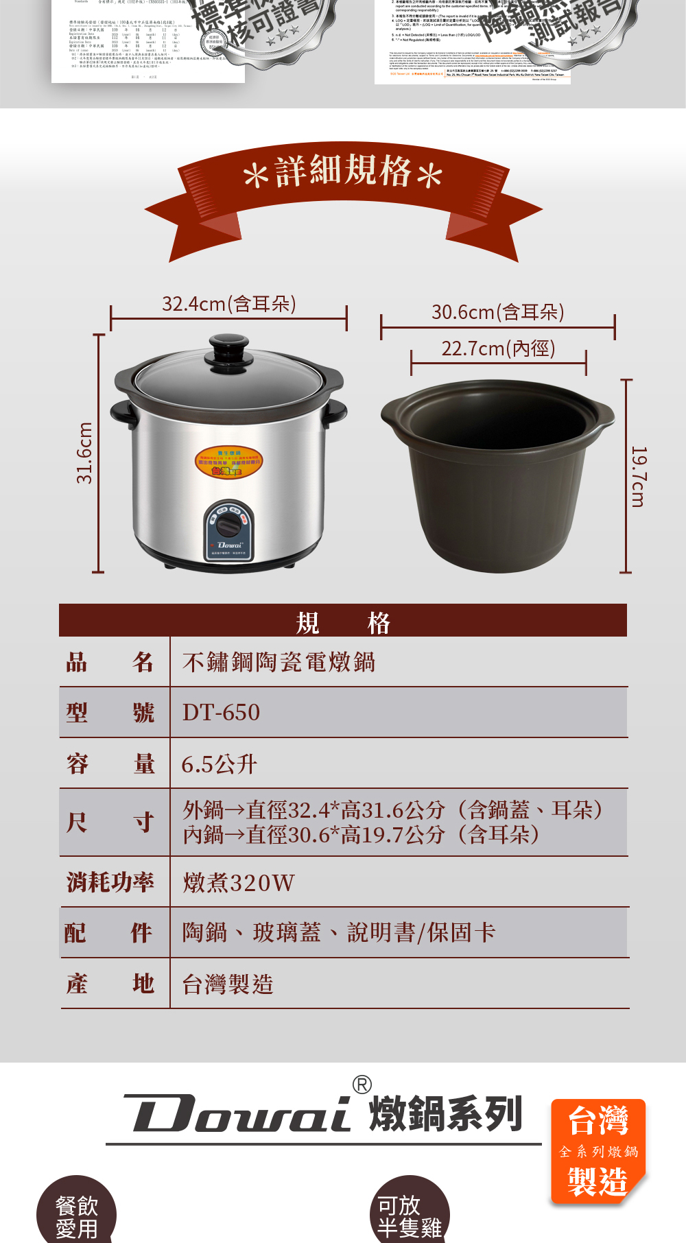 【Dowai多偉官方授權專賣店◆保固一年】Dowai 多偉6.5L不鏽鋼陶瓷燉鍋DT-650 台灣製造 有開發票