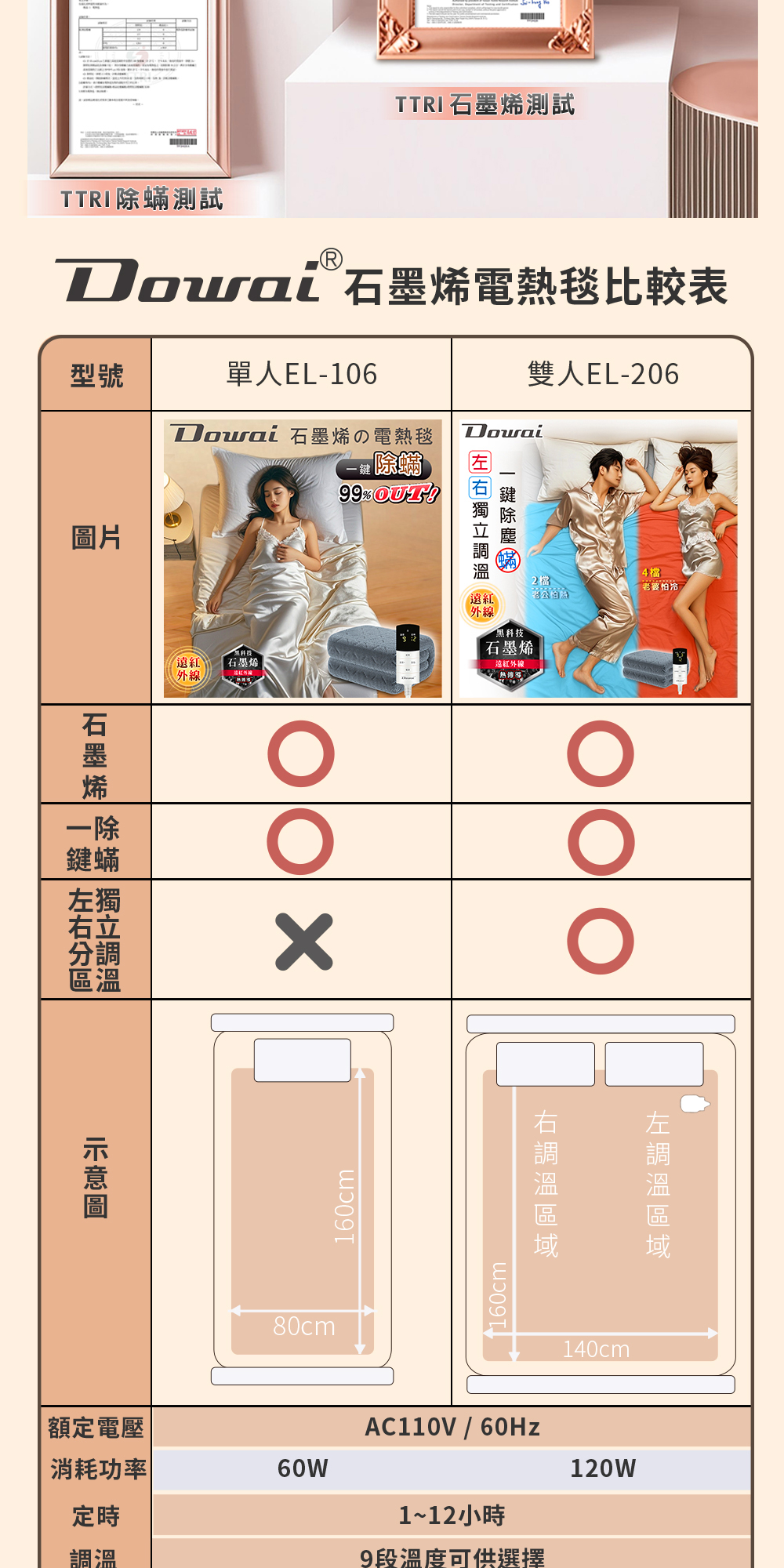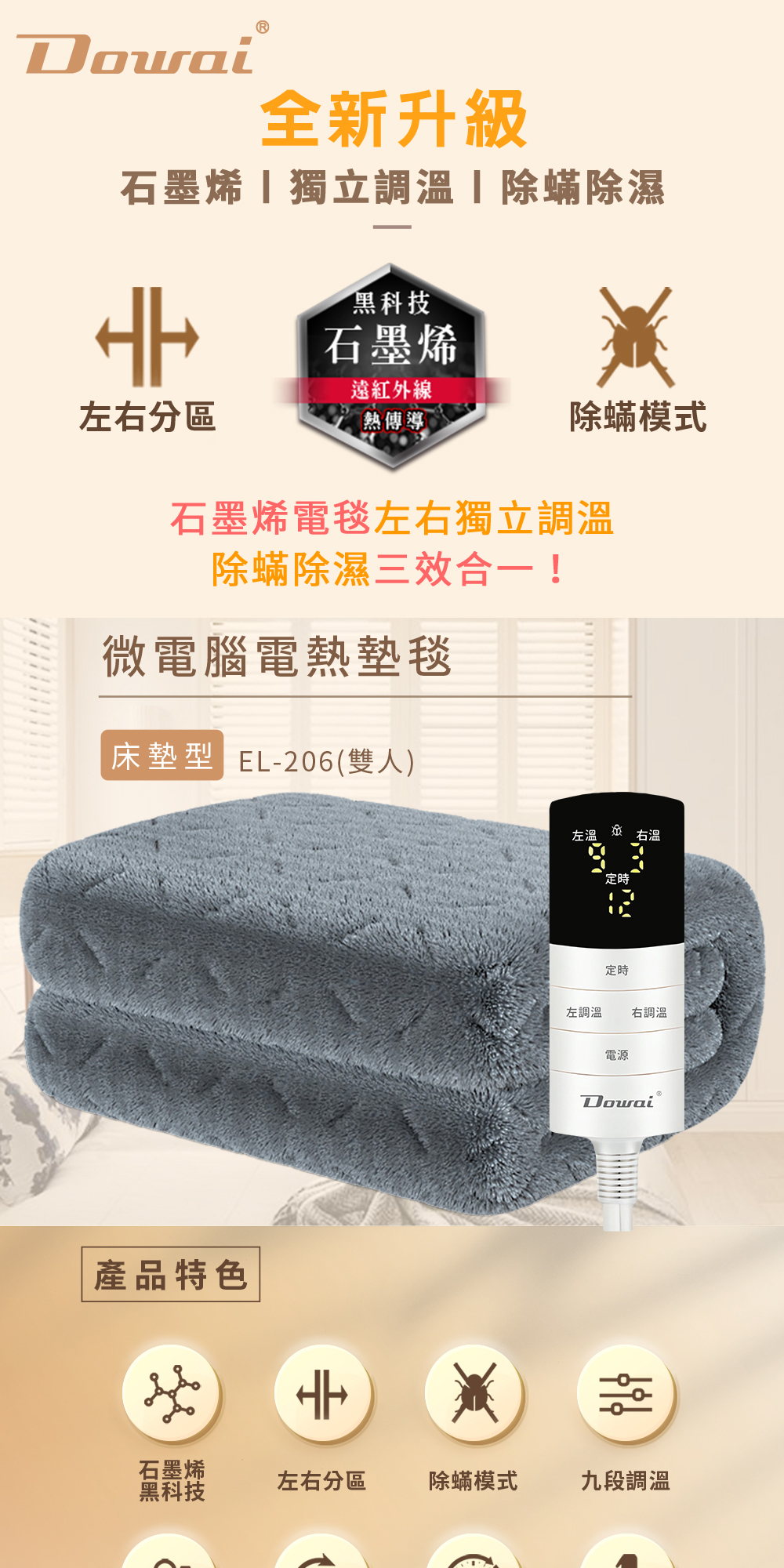 【Dowai 多偉】微電腦雙人可水洗石墨烯電熱毯EL-206(左右調溫、一鍵除蟎)