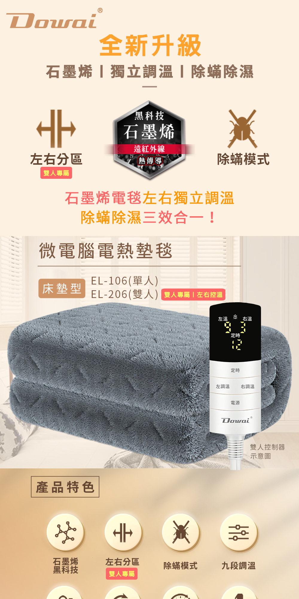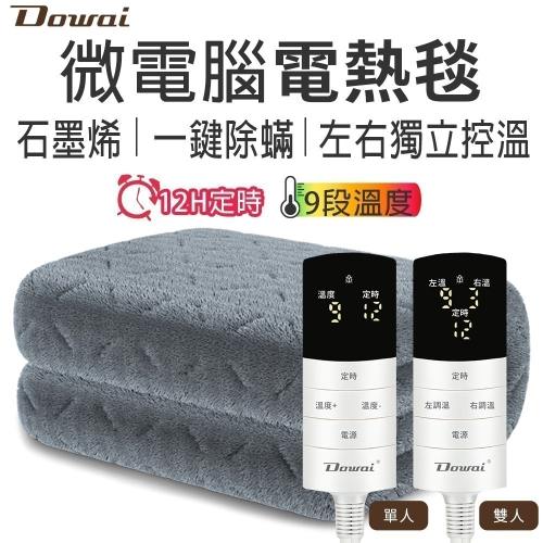 Dowai多偉 微電腦可水洗石墨烯電熱毯 雙人分區獨立控溫 雙人電熱毯 單人電熱毯 一鍵除蟎
