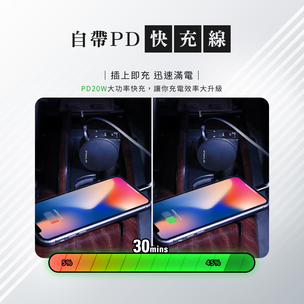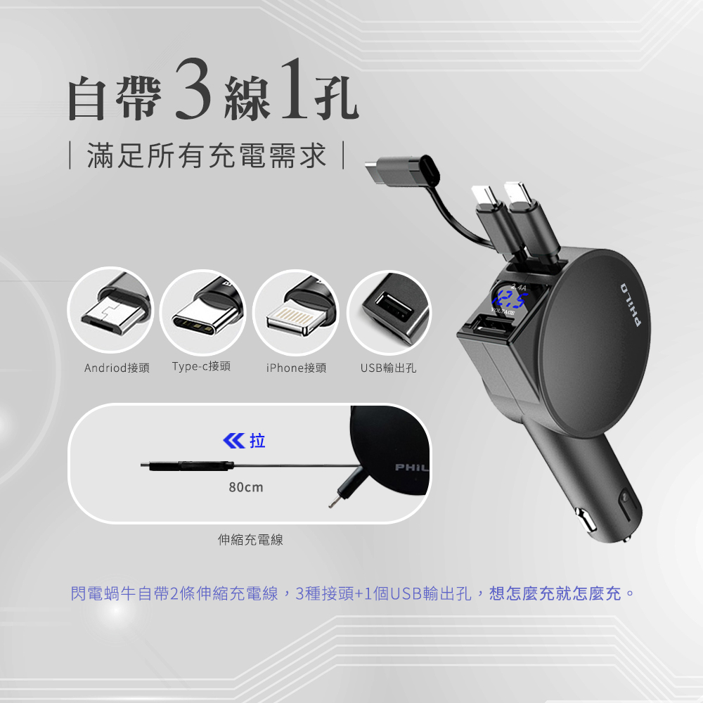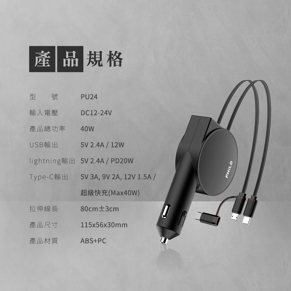 【Philo飛樂】閃電蝸牛 PD20W+QC快充 三合一伸縮充電線 車用充電器 PU24