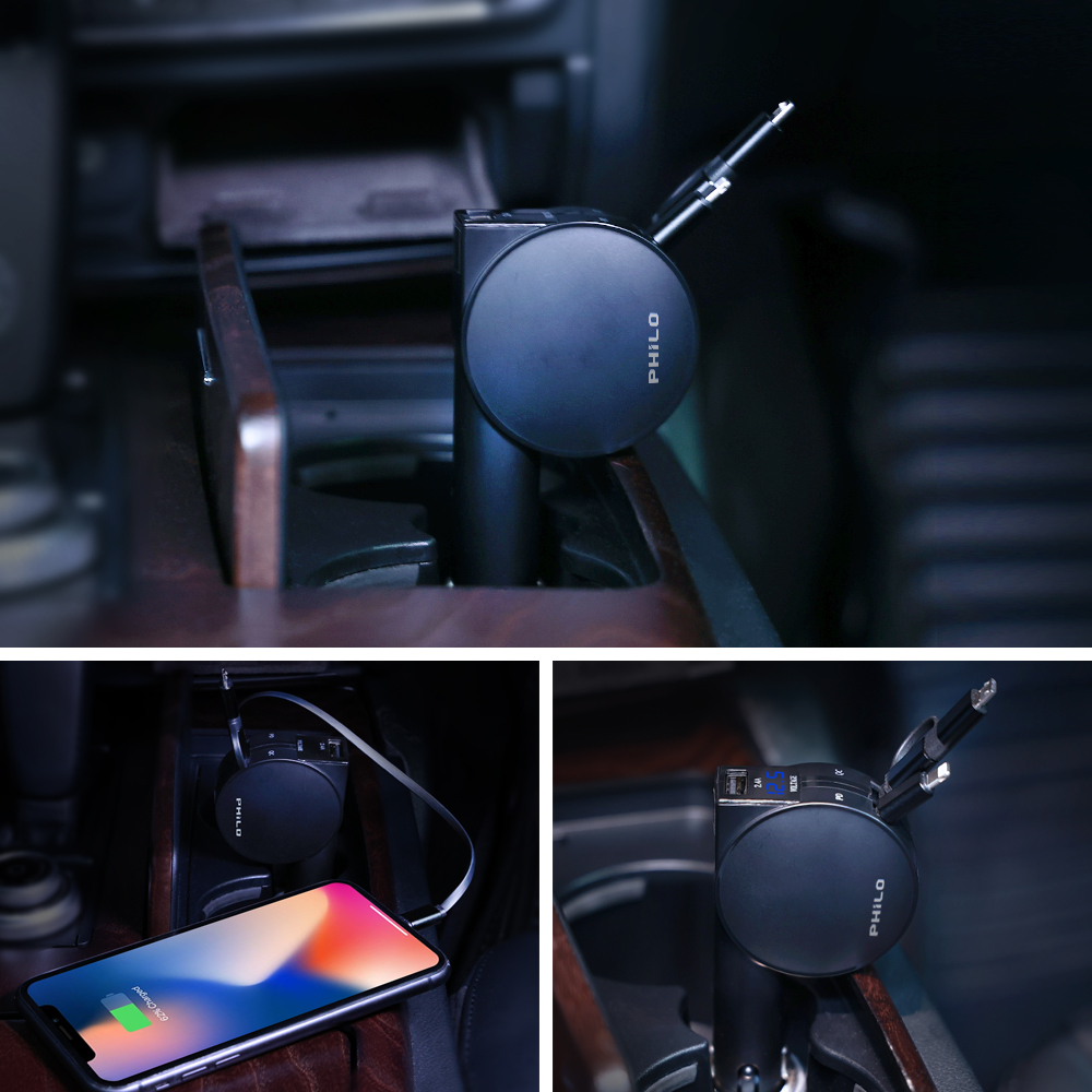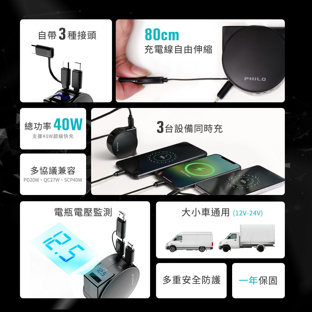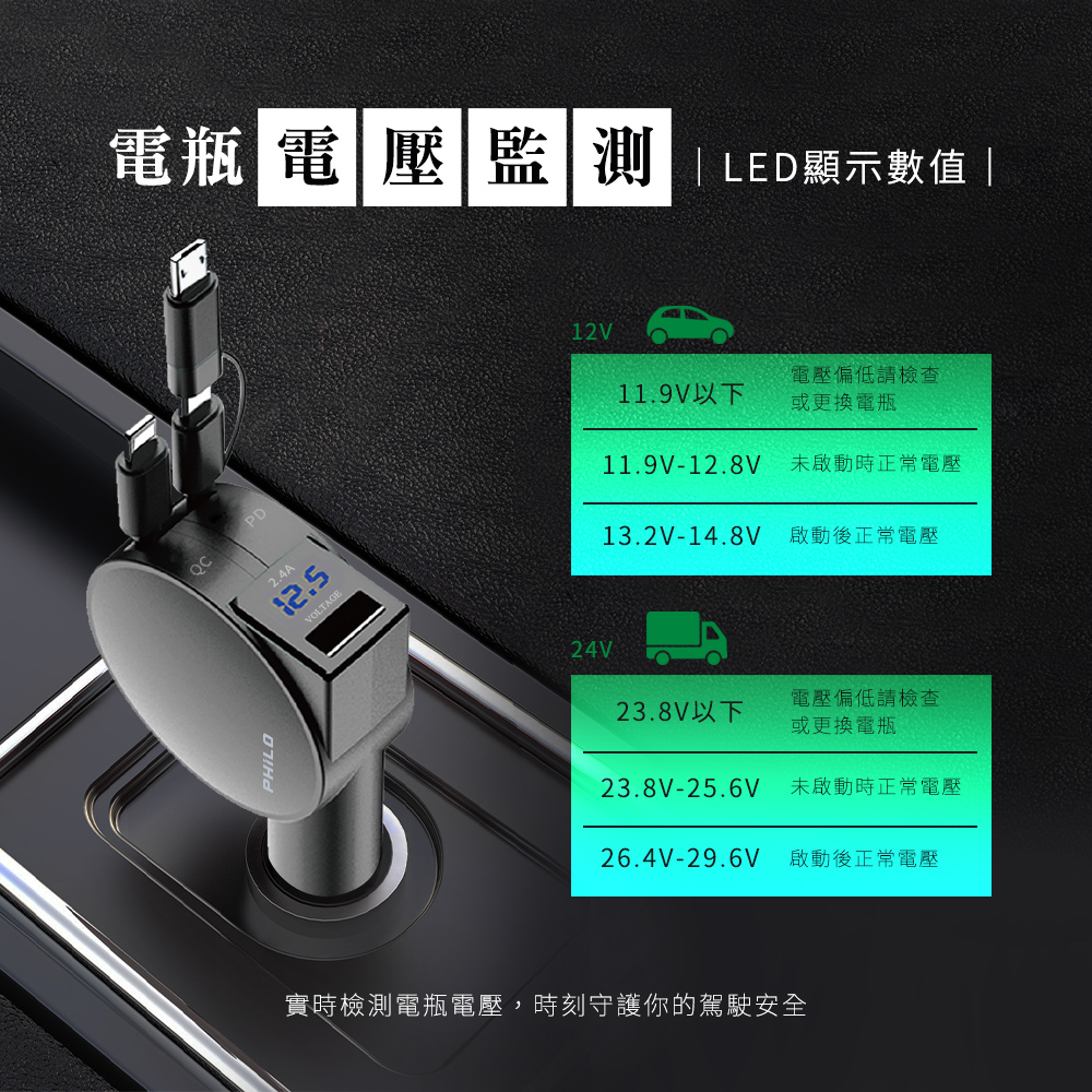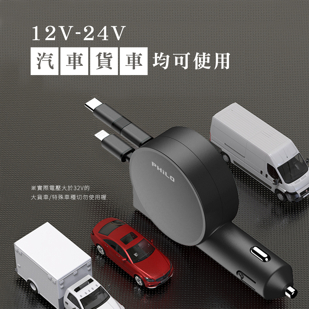 【Philo飛樂】閃電蝸牛 PD20W+QC快充 三合一伸縮充電線 車用充電器 PU24